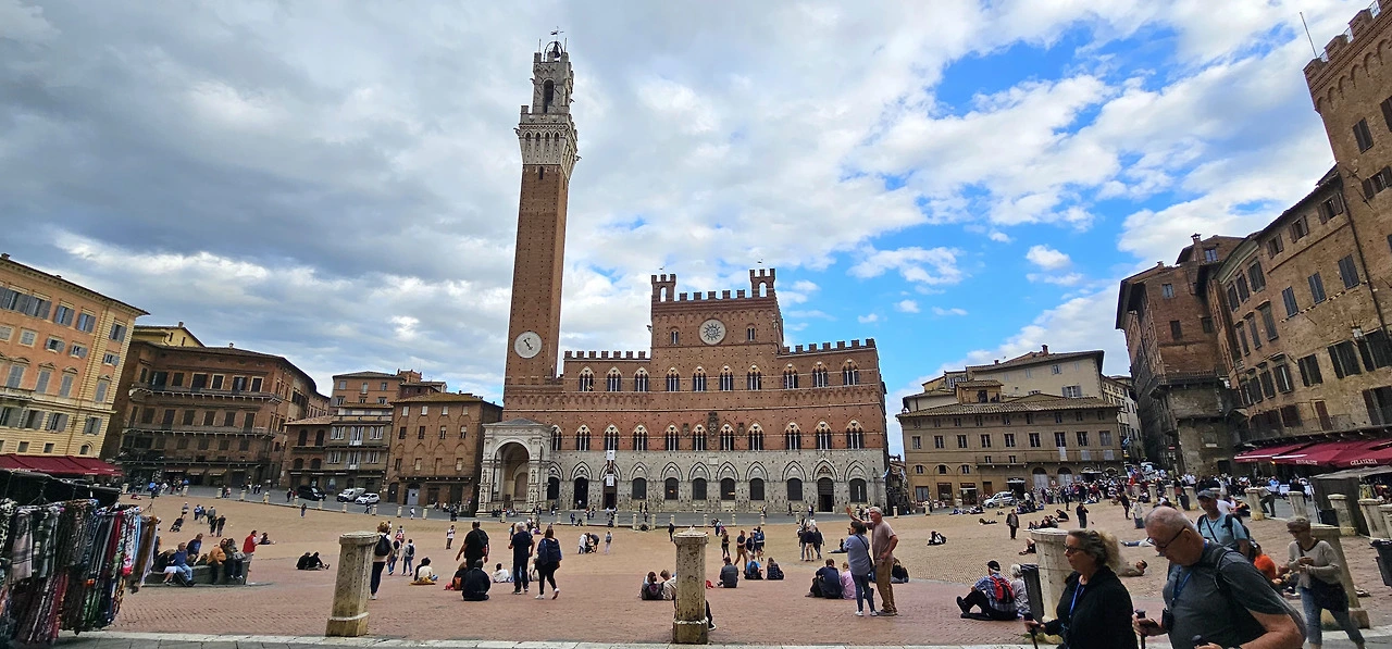 날씨마저 완벽했던 시에나. 체크인을 마친 후, 본격적으로 시내 구경을 나서기 전에, 호텔 마당에서 한동안 멋진 풍경을 감상하며, 다들 멋진 사진들을 찍었다. 호텔은 비용 대비 훌륭한 위치는 물론, 깔끔하고 세련된 분위기까지 갖추고 있어 모두 만족했다. 특히 호텔에서 캄포광장까지는 걸어서 단 5분 거리라는 점이 좋았다. 마침내 도착한 캄포광장. 고동 껍데기 모양의 부채꼴 광장이 우뚝 솟은 만지아의 탑과 함께 서 있는 푸블리코 궁전 앞에 펼쳐져 있었다. 유서 깊은 이곳의 분위기에 절로 감탄이 나왔다.
