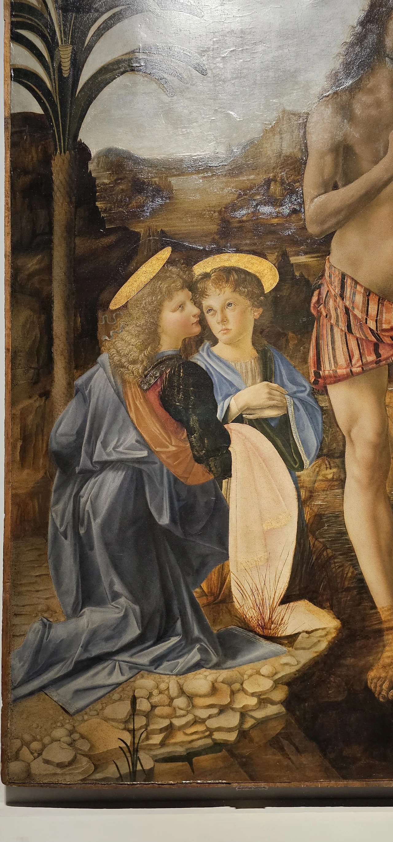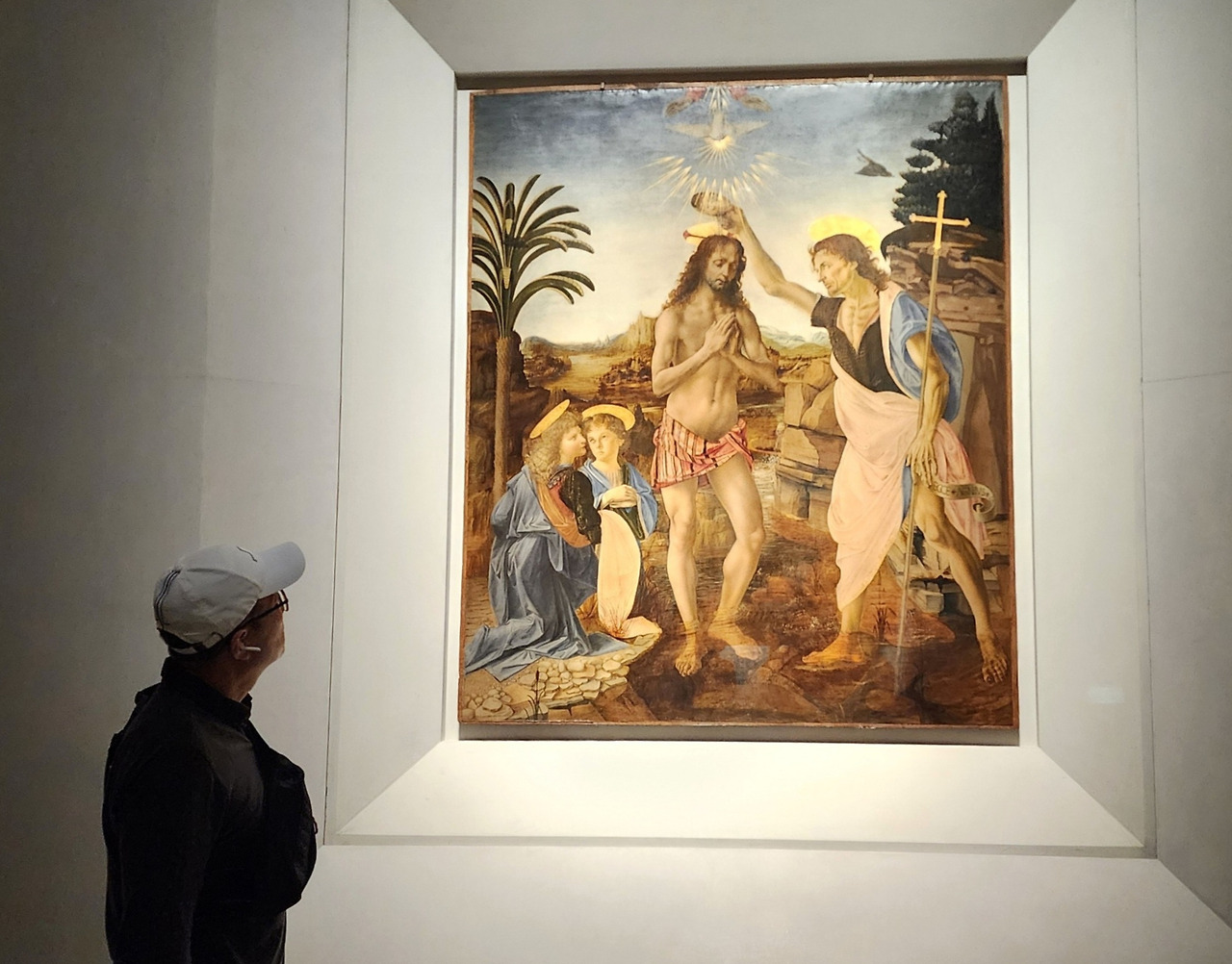 이어지는 작품은 다빈치의 스승인 베로키오가 그린 〈세례 받는 그리스도〉다. 이 그림 왼쪽에 있는 두 천사 중의 한 명을 다빈치가 그렸다고 전해지는데, 다빈치의 솜씨가 너무 뛰어나 베로키오가 그림을 그만두겠다고 했다는 일화가 남아있다. 다만, 이 이야기가 사실인지는 확실하지는 않다.