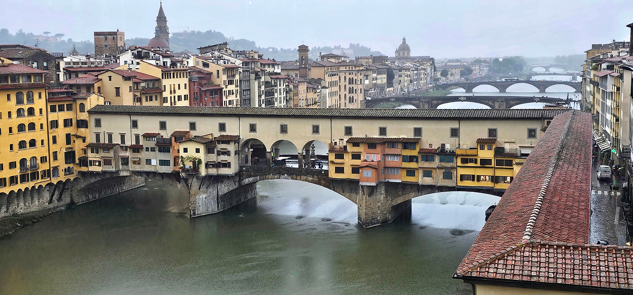 우피치 미술관 3층 복도의 끝에서는 베키오 다리로 이어지는 비밀통로가 있다는데, 아쉽게도 찾지 못했다. 그래도, 복도 끝 유리창에서 베키오 다리의 아름다운 모습을 감상할 수 있었다.