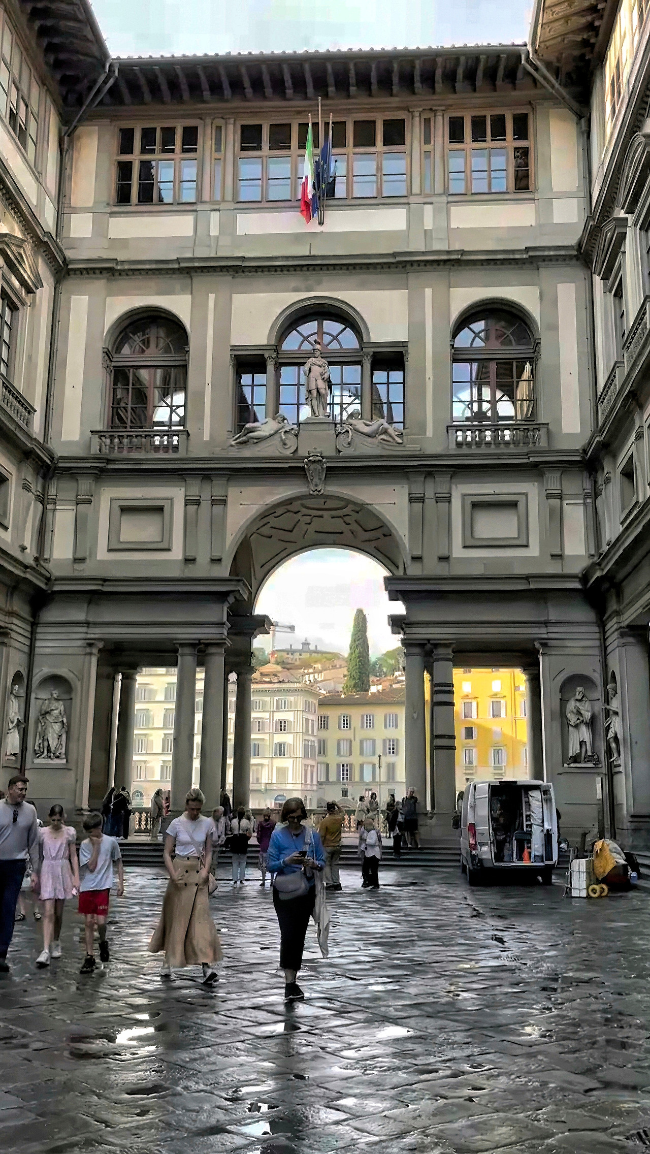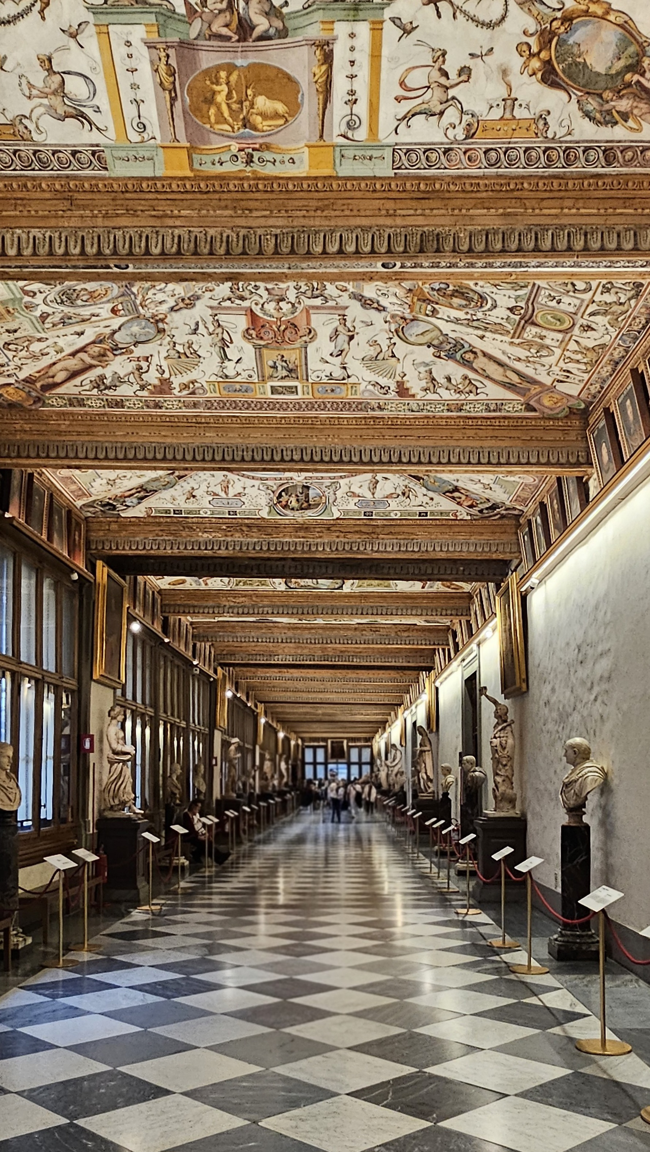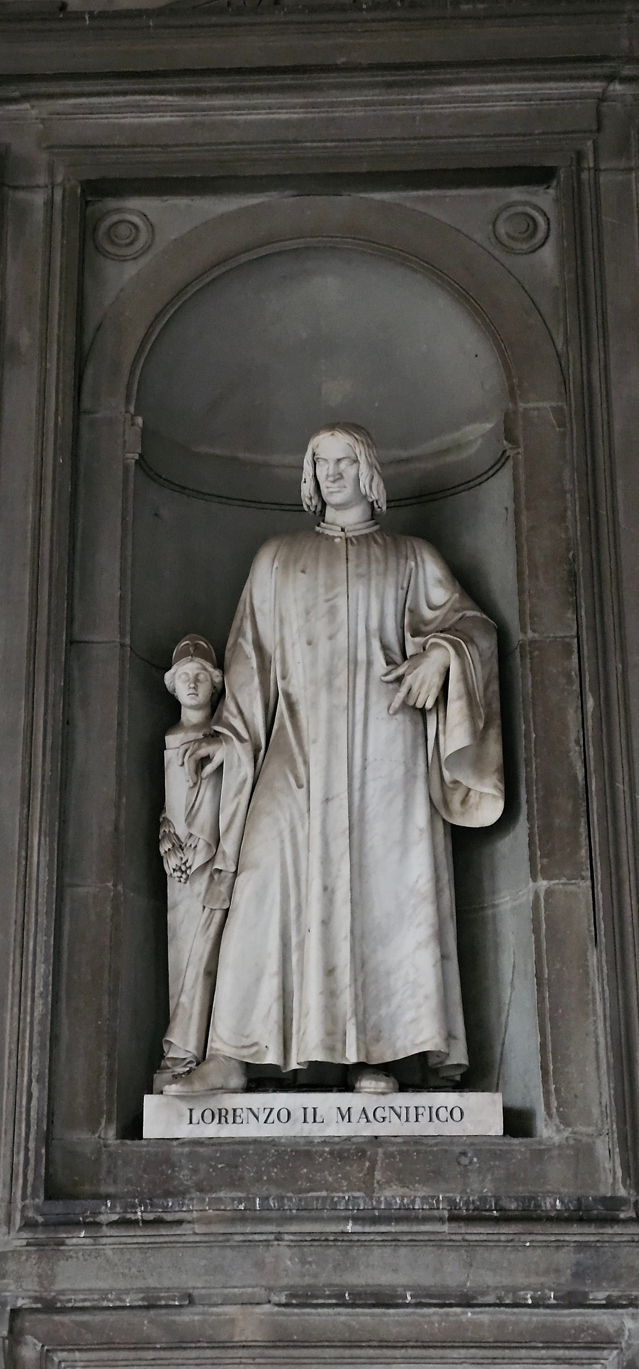 이윽고 우피치 미술관 건물에 도착했다. 가장 먼저 눈에 들어온 것은 건물 외벽에 자리한 벽감(niche) 속 조각상들이었다. 마키아벨리, 갈릴레오 갈릴레이, 단테 등 르네상스 시대를 빛낸 천재들이 우뚝 서 있었다.