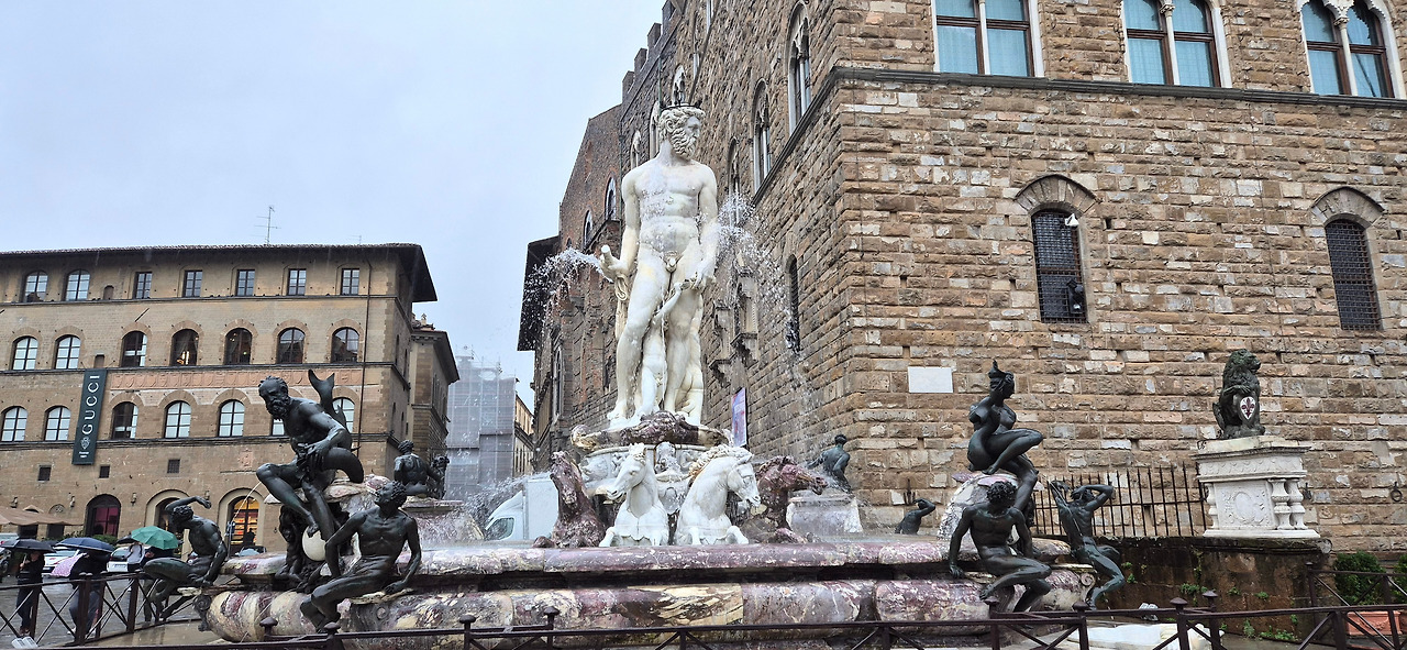 비가 오는 아침, 우피치 미술관 오픈 전에 여유가 있어 시뇨리아 광장을 잠시 둘러보았다. 우산을 펼치고 사진을 찍으려니 여간 불편한 게 아니었지만, 이른 시간이라 그런지 광장에는 사람들이 별로 없었다. 다비드상 복제품, 헤라클레스상, 유디트와 호르페르네스상도 묵묵히 서서 우리를 바라보는 것 같았다.