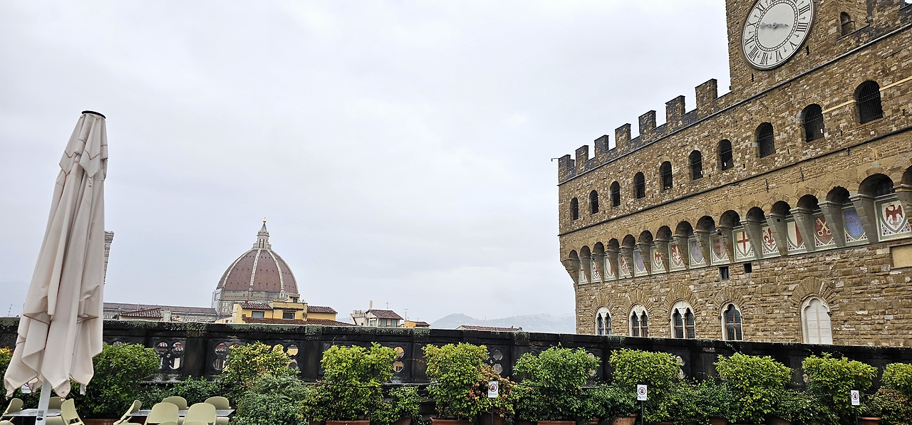 우피치 미술관의 야외 테라스 카페는 명화를 감상하느라 지쳐 있을 관람객들에게 잠시 쉬어 갈 수 있는 공간을 제공해 주는 듯해서 좋아 보였다. 피렌체 구시가지의 고풍스러운 건물들 사이에서 따뜻한 커피 한 잔을 즐기고 싶었지만, 역시 시간적인 제약으로 인해 그러지 못했다. 대신, 빗속의 카페 앞마당에서 몇 장의 사진을 남기며 아쉬움을 달랬다.