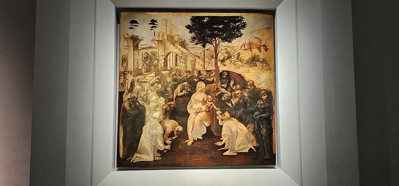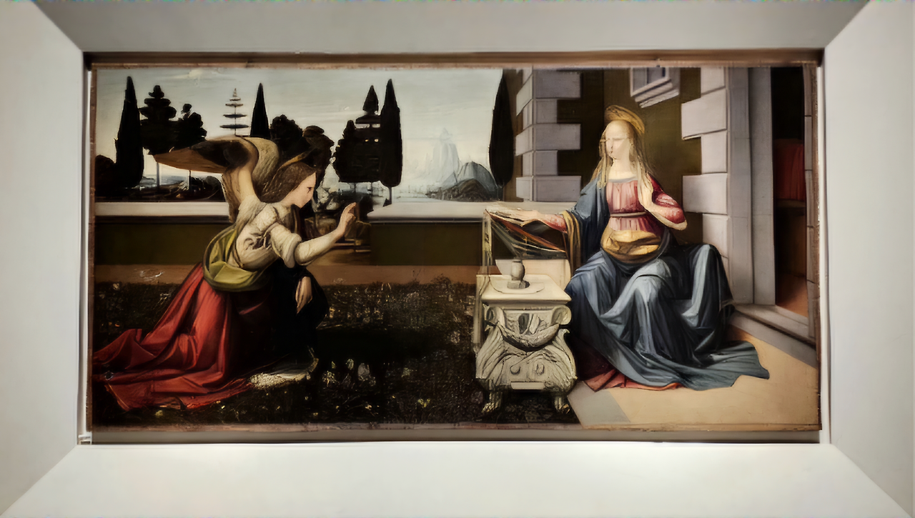 다음 전시실에서는 레오나르도 다빈치의 명작 〈수태고지〉를 감상할 수 있었다. 수태고지는 신약에서 하나님의 사자인 가브리엘 천사가 동정녀 마리아 앞에 나타나 그녀가 하나님의 아들을 잉태할 것이라고 말하는 순간을 일컫는 용어다. 일부에서는 마리아의 오른쪽 팔이 지나치게 비정상적으로 길다고 비판하기도 하지만, 이 작품은 원래 오른쪽 위의 벽에 걸릴 의도로 제작되었으며, 정면이 아니라 오른쪽 45도 각도에서 바라볼 때 가장 자연스럽게 보이도록 구성되었다. 이를 고려하면, 비율이 오히려 정확하게 계산된 것이 아닐까 하는 생각이 들었다.