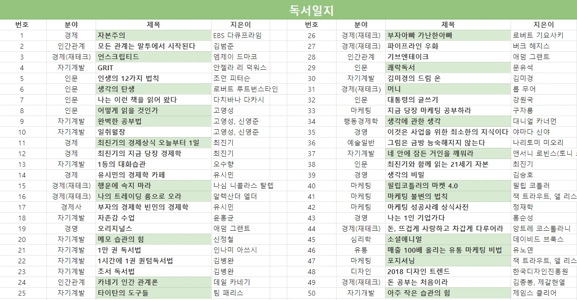 내가 읽었던 50권의 책들은 다음과 같다. 제목이 초록색으로 칠해진 것들은 내가 감명 깊게 읽은 책이고, 다시 한번 읽어 봐야 할 책이라고 표시를 해둔 것이다.