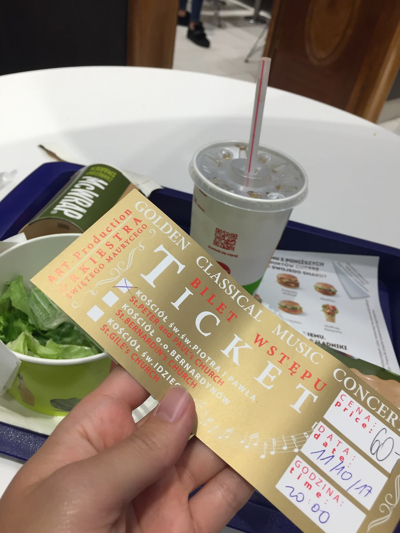피터 앤 폴 성당에서 클래식 콘서트가 열린다는 현수막을 보고 오늘 저 공연을 꼭 봐야겠다고 생각했다. 클래식 콘서트는 화요일, 금요일 그리고 주말에만 열리기 때문에 내가 정한 일정 상 오늘이 아니면 영영 볼 수 없게 돼버린다. 맥도널드에서 샐러드를 먹으며 아낀 돈으로 클래식 콘서트 티켓을 구매했다. 티켓을 구매하는 순간부터 설레기 시작했다. 공연장에 20분 전에 도착해 가장 앞자리에 앉았다.