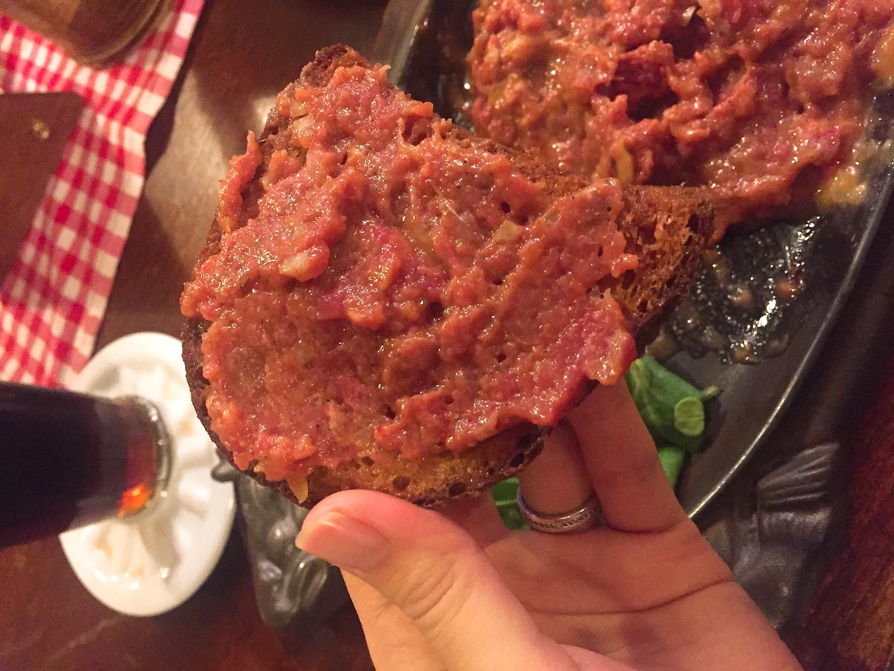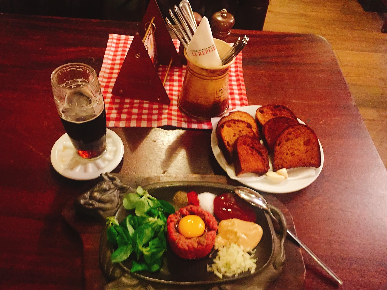 민박집으로 들어가려다 첫 새로운 나라에 도착한 첫날에는 맛있는 현지 음식을 먹고 힘을 내야 한다는 나름의 전통을 이어가기 위해 숙소 근처 LA REPUBLICA에 갔다. beef Tartar라는 바삭하게 구워진 바게트 빵 위에 생 마늘을 바르고 육회를 올려 먹는 음식을 시켜 체코의 유명한 맥주 코젤과 함께 먹었다. 바삭하고 알싸한 마늘향이 양념에 버무려진 육회와 어우러지는 느낌. 거기에 맛있는 코젤 다크. 체코 여행도 잘할 수 있겠지. 그래도 여긴 한인 민박이니 아침에 밥과 국을 먹을 수 있다. 아, 내가 프라하에 8년 만에 다시 왔구나.
