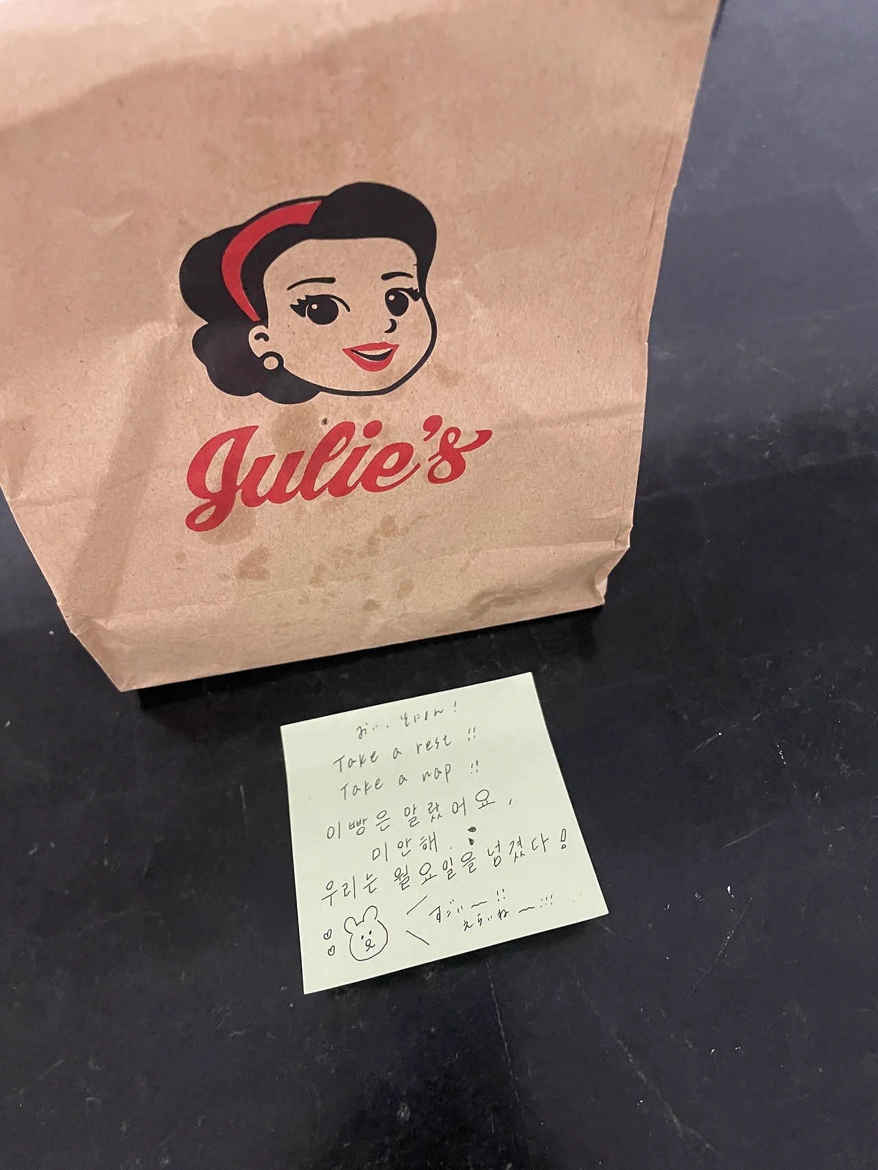 씩씩함과 강단이 돋보이는 카요코는 미야자키 출신으로 오사카에서 간호사로 일했다고 한다. 코로나 대응 센터에서 일하면서 온갖 일들을 많이 겪어서인지 그녀는 웬만해선 쫄지 않는다. 그리고 알려주는 한국어를 찰떡같이 소화해 낸다. 일본어로 00상을 한국어로 어떻게 말하냐고 물어봐서 ‘씨’를 붙이면 된다고 알려주니 62세 양산 고깃집 사장님에게 ‘이 씨, 밥 먹었어요?’라고 해서 너무 웃겼다.(고깃집 사장님 일본 이름은 ’이상‘이다.) 귀엽기도 하고 ’이상‘과 ’이 씨‘ 사이의 그 미묘한 차이를 어떻게 설명하면 좋을지 몰라서 그냥 두었더니 가끔씩 ’이 씨, 귀 괜찮아요?’, ‘이 씨, 배불러요?’라는 멘트를 종종 날려서 나를 즐겁게 한다.(이상은 수영하다 귀에 물이 들어가서 병원에 갔다 왔다.) 매일 밤늦게까지 학원 자습실에 머물면서 영어를 공부하는데, 너무 무리를 한 탓인지 그녀의 눈은 졸음으로 매일매일 작아지고 있는 중이다.