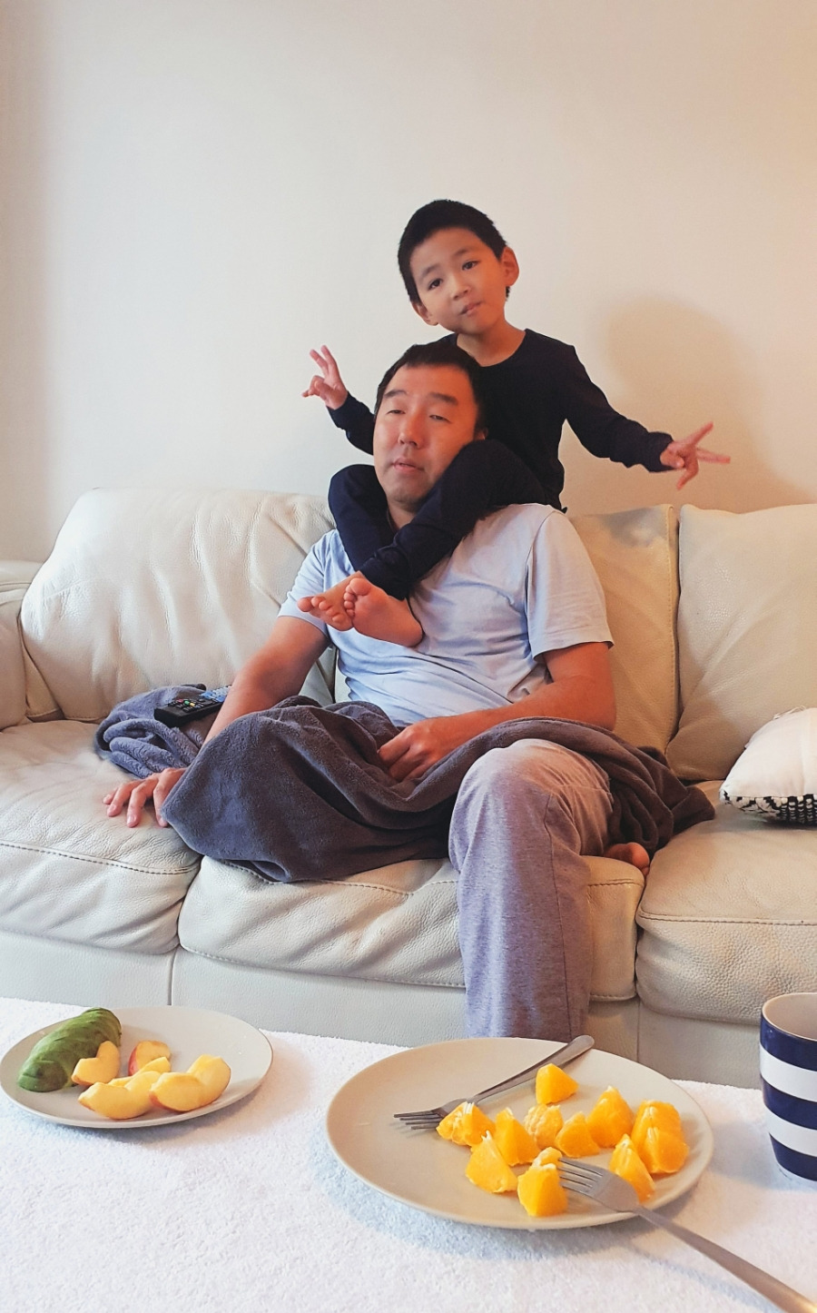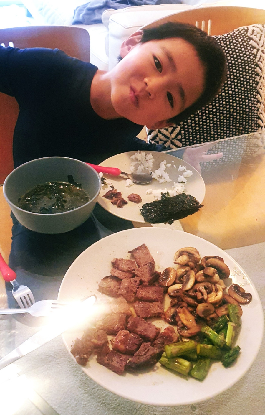 무릉도원(?)을 온 몸으로 즐기는 아빠와 아들, 호주의 신선한 식재료로 소고기스테이크, 아스파라거스, 쌀밥에 미역국, 김구이까지! 많이 먹고 얼른 싹 낫기를 바라.