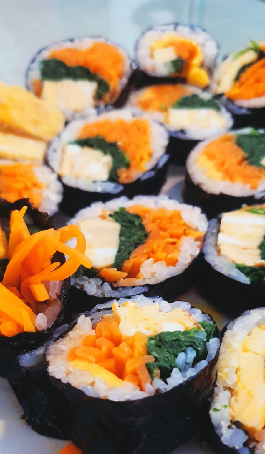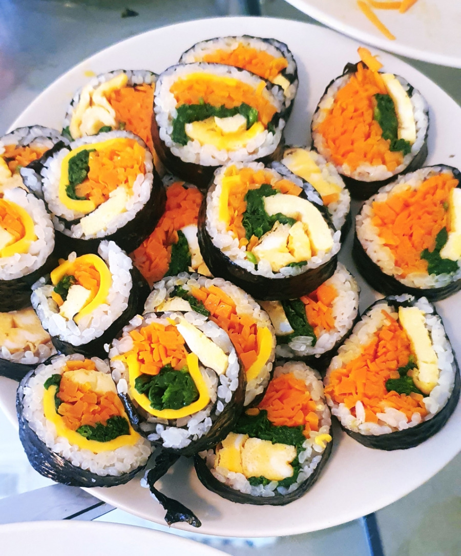 한인마트에서 공수한 김밥김과 쌀밥, 당근, 시금치, 계란, 치즈를 넣은 집김밥! 김발없이 말으니 쭈글쭈글하지만...그래도 진짜 맛있어요. 말해주는 아들이 있어 행복합니다.