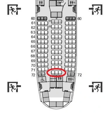 갤리와 화장실이 뒤쪽에 있고, 양 옆의 좌석이 비어있는 맨 뒷줄.