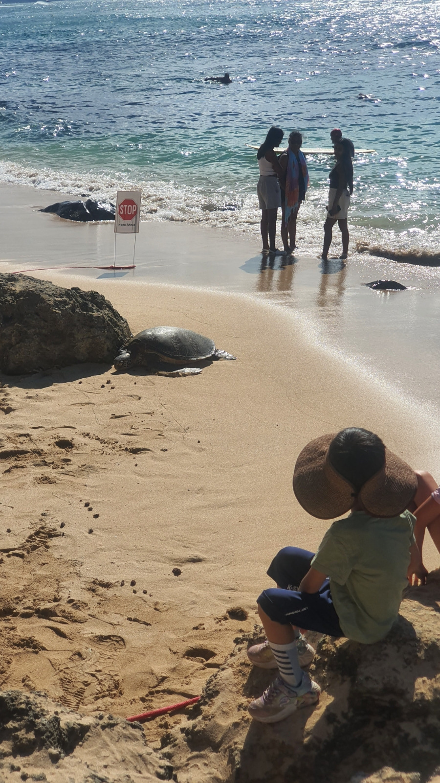 상업화된 여행 코스를 밟는다고 죄책감을 가질 필요는 없지만, 특별한 여정의 우리이기에 왠지 이단아가 되고 싶다. <Dole Plantation>이나 <지오바니 트럭>의 스캄피는 예상한 만큼의 감흥이었다. 무난히 마음 편하게 여권 스탬프를 받는 기분을 즐기고 바다거북을 관찰할 수 있는 해변으로 이동한다. 운이 좋으면 바다거북이 해초를 질근질근 씹는 장면도 볼 수 있지만, 허탕 치는 이들도 많고 벌에 쏘이는 아픔을 겪기도 한다. 저 멀리 차를 세우고, 땡볕 아래를 한참 걷는다. 해변가 중앙에 유독 사람들이 모여 있다. 바다거북을 직접 보는 건 말로 표현하기 힘든 여러 감정이 교차된다. 인간이 갖지 못한 삶의 속도에 대한 경외심과 인내에 말로 표현하기 힘든 연민이 든다. 등껍질 곡선의 아름다움과 더불어 그 짐을 지고 몸을 맡기며 살아가는 삶...
