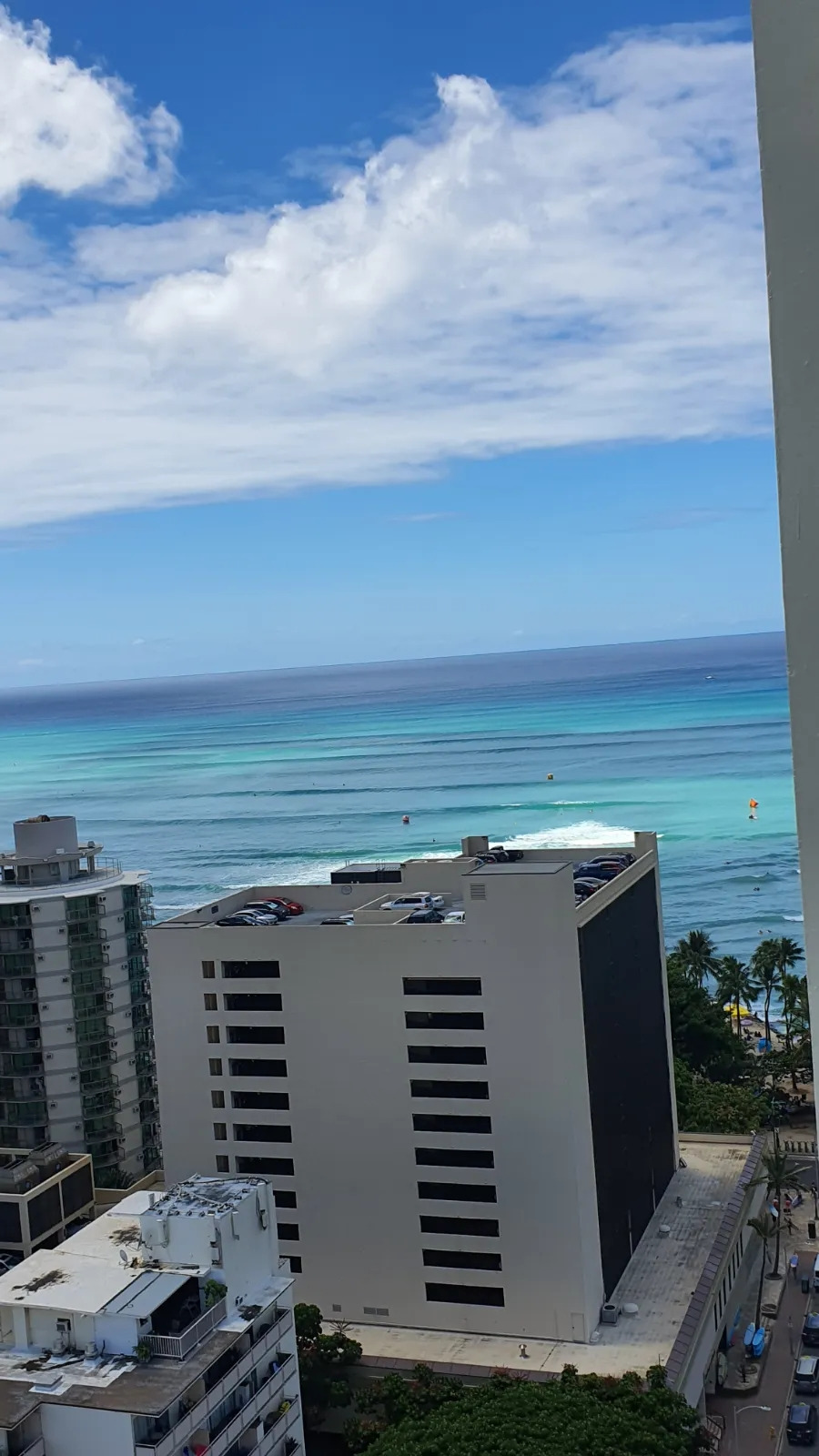 33층 숙소 발코니에서 바라본 와이키키 해변의 모습