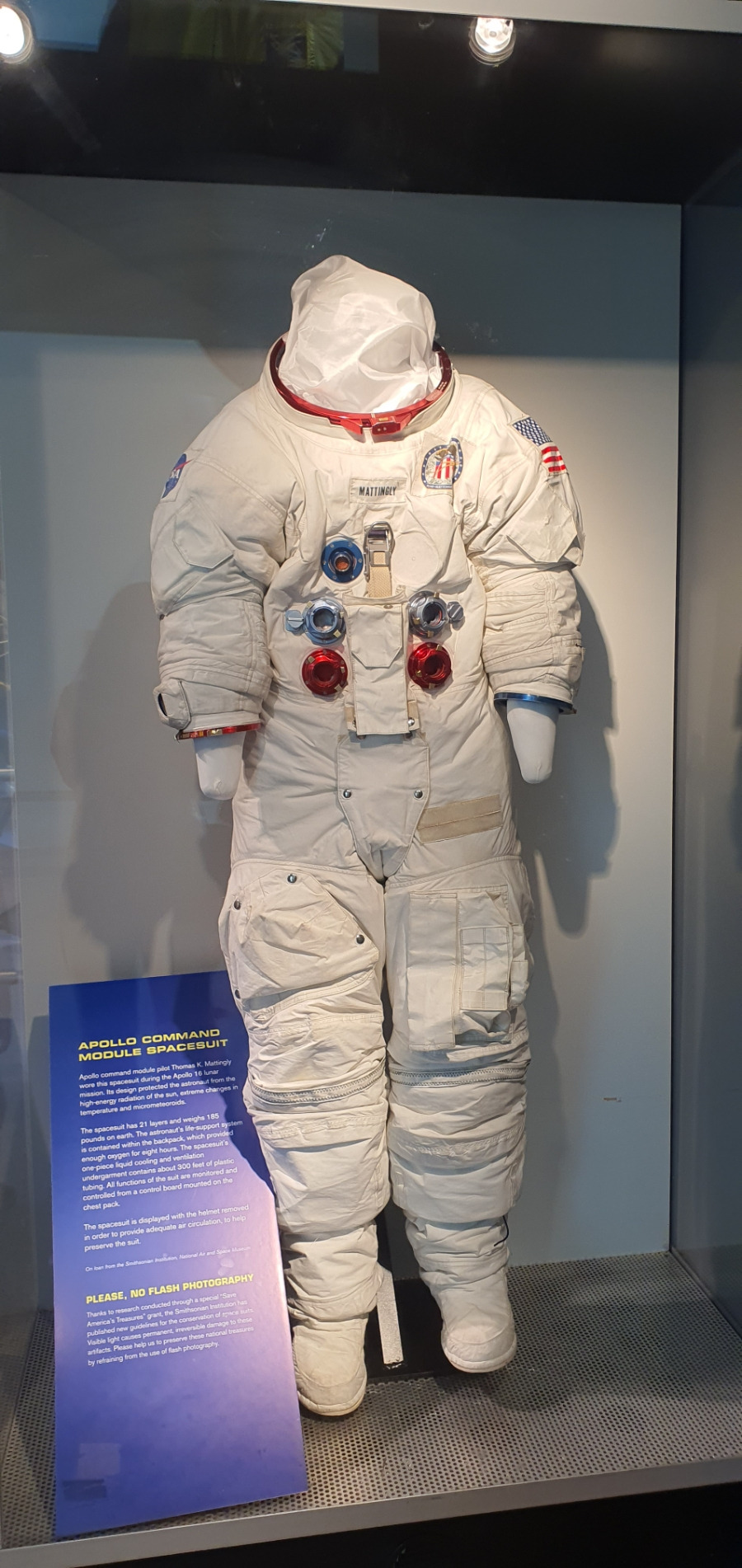 아폴로 탐사 시 착용했던 우주복 샘플과 오른쪽은 실제로 탐사에 활용된 우주선 기체.