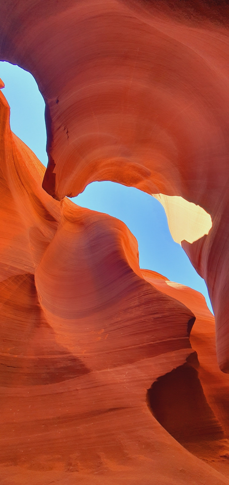 좁디좁게 휘감은 높은 협곡과 수억 년의 긴 세월 동안 바람이 완성해 낸 곡선의 아름다움은 자연에 대한 겸허함을 넘어선다. 그 어디서도 볼 수 없는 독보적인 나이테와 곡선을 손 끝으로 만진다. 단단하고 거친 표면 아래 따뜻함과 포근함이 느껴진다. 갓난아기 다루듯 어루만지면 마음마저 편안해진다.