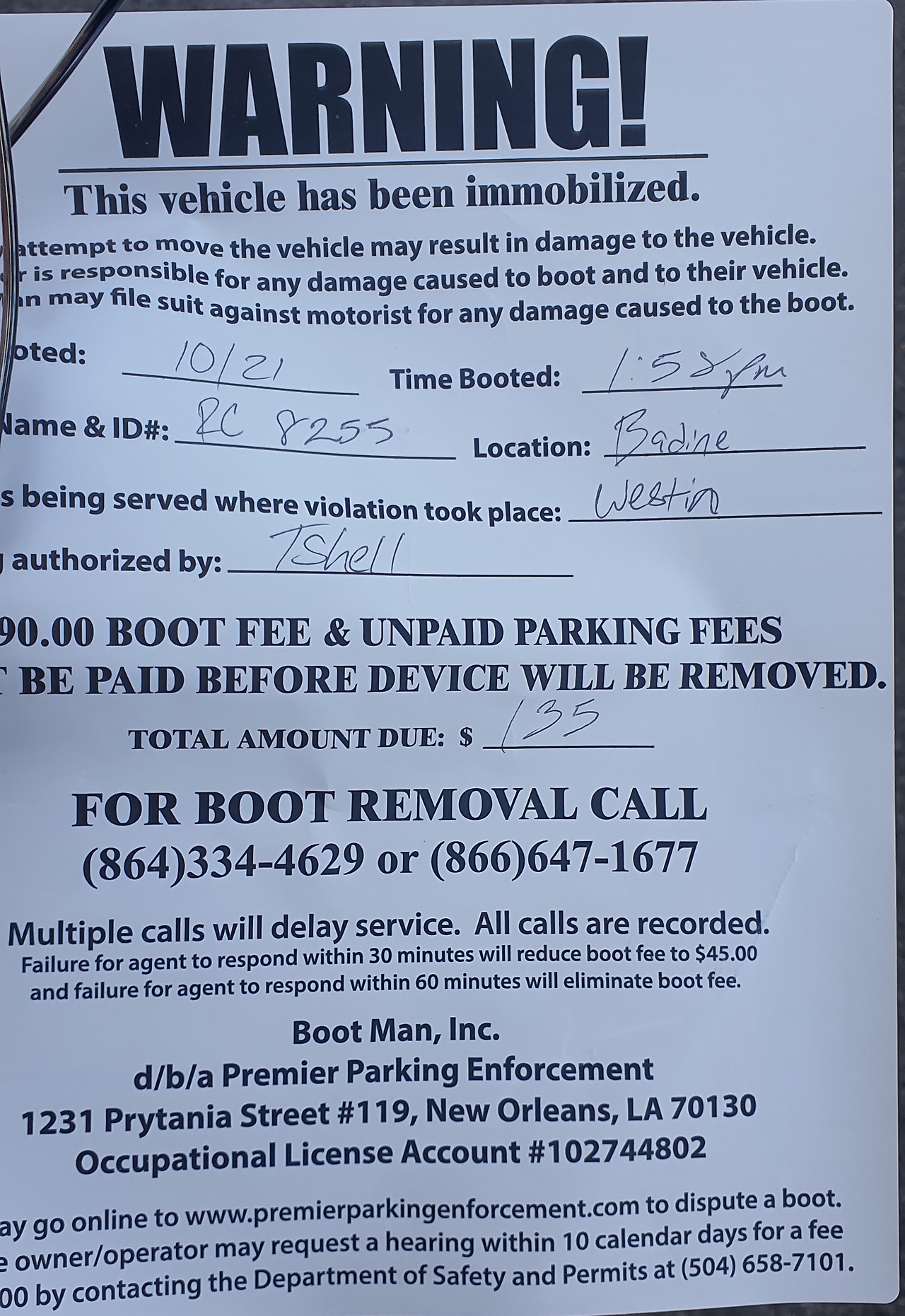 새까맣게 선팅된 검은색 차량이 주차장을 순회 중이다. 자초지종을 설명했지만, 그 직원은 135달러에서 12달러를 주차비로 냈으니, 추가로 123달러를 내야 한다. 유감이지만, 그것이 법이라고 했다. 직원은 차에서 내려 바퀴에 달린 노란색 자물쇠를 풀어주었다.