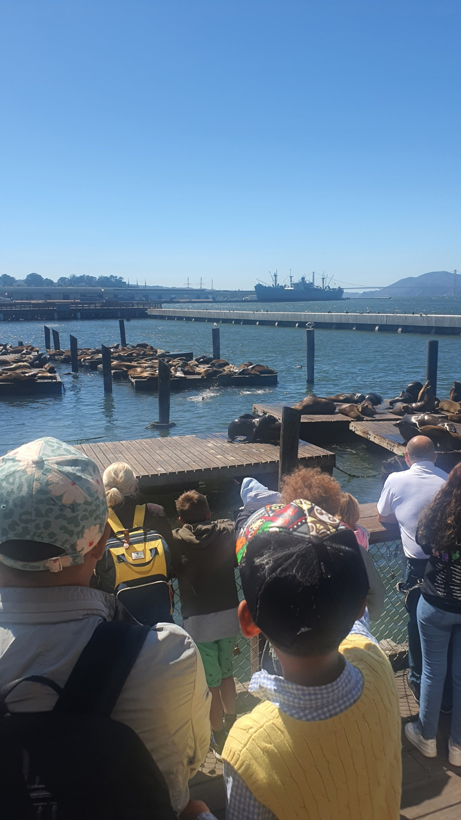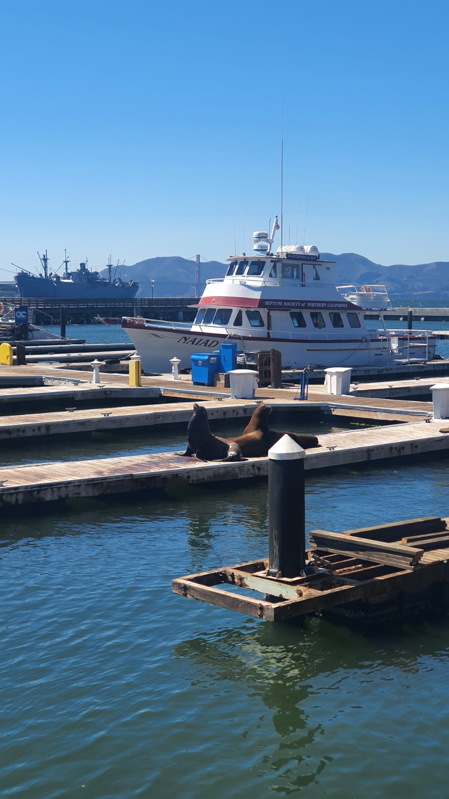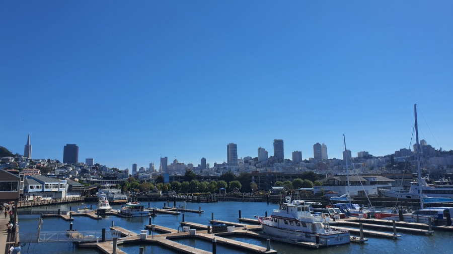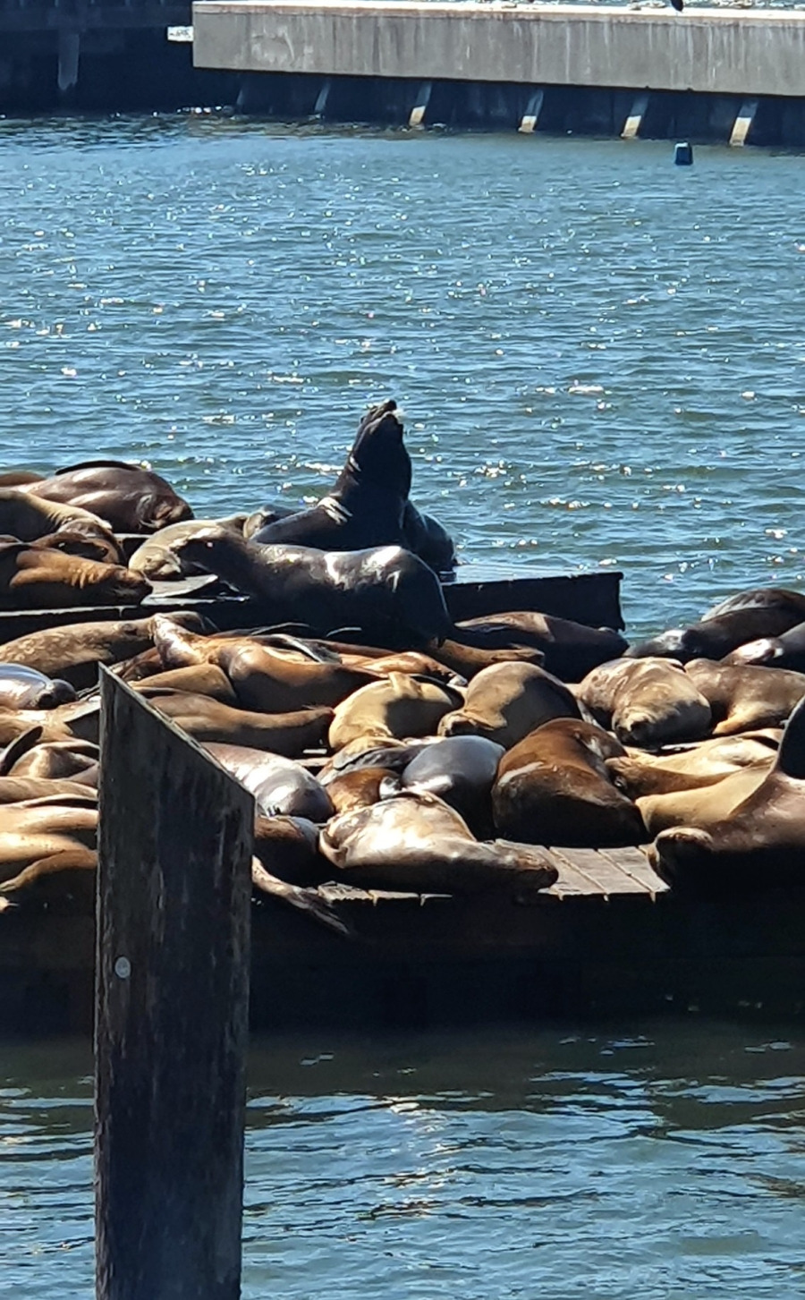 동물원이 아닌 장소에서 야생동물을 만나는 건 언제나 신비롭다. 더구나 미국을 대표하는 대도시에선 몹시 드문 일이다. 그런데 눈앞에 바다사자 수백 마리가 나무 가판대에 누워 일광욕을 하고 있다. 서로 싸우는 녀석들도 있다. 그들의 울음소리가 무슨 신호를 보내는지는 모르지만, 활기찬 분위기를 선사한다. 멀리 붉은빛의 금문교가 있고, 우측에는 알카트라즈 감옥의 위용 있는 모습이 보인다. 탁 트인 하늘과 함께 푸른 바다까지,, 정말이지 보기 드문 광경이다.