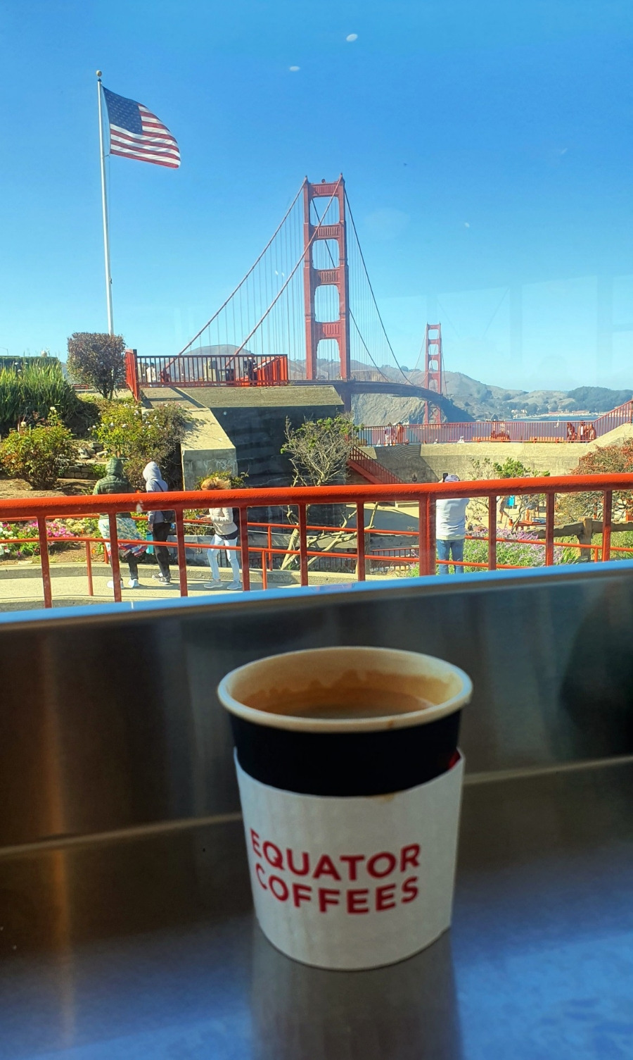 어린아이처럼 신이 난 모습을 보며, 남편은 내가 여전히 젊다고 한다. 샌프란시스코의 상징인 금문교는 단출한 디자인이지만, 그 단조로움이 아름다움을 더한다. 촘촘한 원형의 곡선 프레임이 서로서로를 지탱하며 안정감을 준다. 금문교의 붉은색 또한 지금의 명성에 큰 역할을 했다. 언제나 새로운 시도에는 반대가 따른다. 평범한 콘크리트 색으로 만들었다면 한 도시를 대표하는 대표성은 사라졌을 것이다. 무엇보다 빨간색이 연출하는 풍경이 가장 강렬하고 인상적이다. 금문교를 감상할 수 있는 포인트와 다양한 각도의 포토존이 있기에 더욱 매력적이다. 잠시 머물렀던 커피맛이 훌륭한 <Equator Coffee>에서도 금문교를 즐길 수 있었다.
