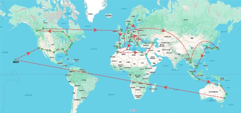 여행 전에는 일단 친숙한 아시아에서 한 달 정도 워밍업 후, 오세아니아를 거쳐 북미로 넘어갔다가 유럽으로 가자는 대략적인 계획을 세웠어요. 실제로 여행하면서, 비행시간을 위해 호주에서 미국으로 넘어가기 전 기착지 하와이를 거쳤고, 유럽의 쉥겐조약을 감안해서 유럽 대륙 체류 89일째 북아프리카 대륙으로 넘어갔다가 다시 유럽으로 돌아오는 루트가 되었습니다. (북아프리카에서 4개월 넘게 머물게 될 줄은 꿈에도 몰랐지만..)