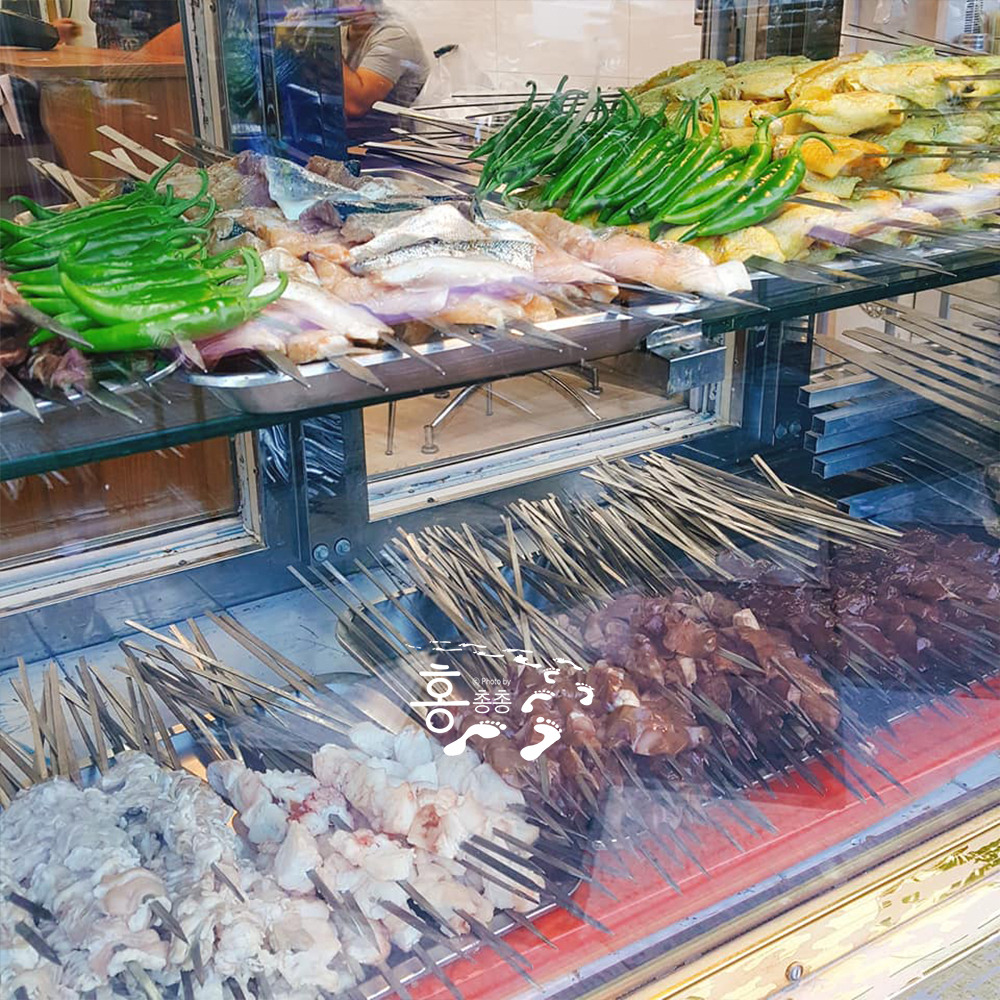 바로 앞 식당은 사람이 한 명도 없다. 이 집만 줄을 길게 선거 보니 유명 식당인 게 분명하다. 번호표를 받고 들어가니 아니나 다를까 2층 식당 전체가 발 디딜 틈이 없다. 다행히 영어 메뉴판이 있어 치킨&양 어쩌고 케밥을 고르고 식판을 하나 뽑아 들고, 배식대를 지나면서 먹고 싶은 걸 하나씩 담는 시스템.