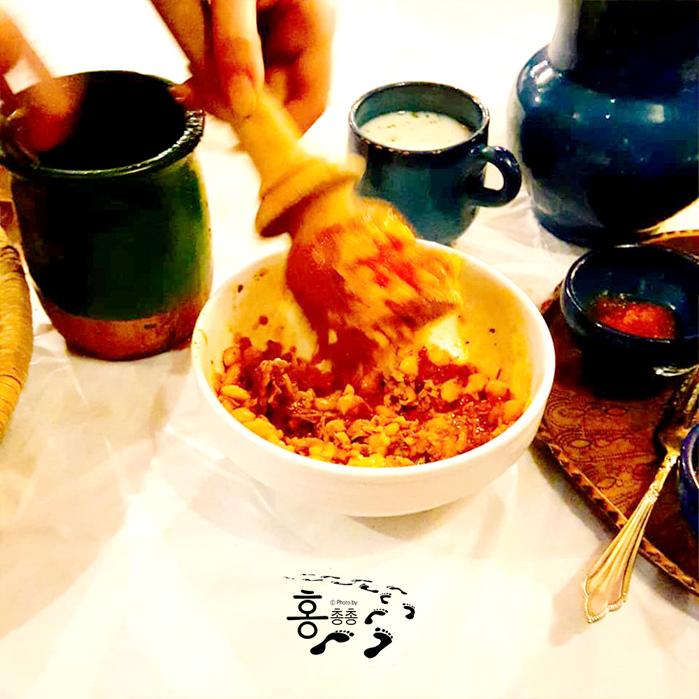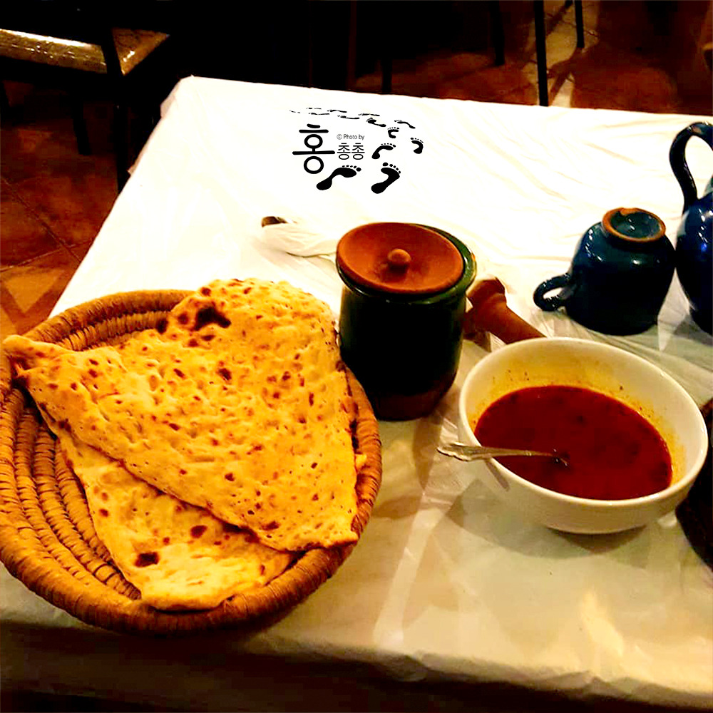 반찬들은 향신료 도가니라 확실히 호불호가 갈리는 상황이고, 으깬 디지는 꽤 맛있다. 고기와 야채를 푹 고았으니 식감도 보들보들하다. 사정없이 으깨진 디지를 그냥 떠먹고, 헝겊 같이 생긴 빵에 찍어먹거나 말아먹기도 하고, 따로 담아둔 디지 국물도 홀짝여본다.