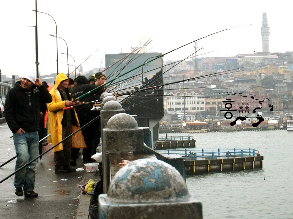 갈라타 다리 위에는 손낚시를 하는 사람들이 일렬로 줄지어 서 있다. 광경이 여행자의 호기심을 자극한다. 기웃거리며 뭘 잡았나 봤더니 전갱이, 잉어, 고등어 등 각 종류의 생선이 제법 차 있다. 갈라타 다리에서 물고기를 낚는 사람들은 팔기 위해서라기보다는 가족들의 그날 끼니를 위해 낚싯대를 던지거나, 소일거리를 즐기는 중이다. 그래서 갈라타 다리는 490m 이상의 축복이다.