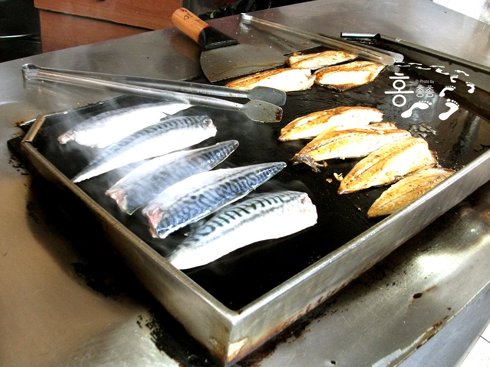 가게에 들어서면, 입구의 철판 위에서 고등어 반 손이 지글지글 구워지고 있다. 모양 새가 익숙하다. 반은 노점인 이 작은 가게의 셰프는 소금 간을 한 고등어를 나란히 눕혀 놓고 굽다가 일정 시점에 일괄 뒤집는다. 겉면이 노릇노릇하게 구워진 고등어는 껍질 쪽 태비(tabby)로 돌아눕는다.