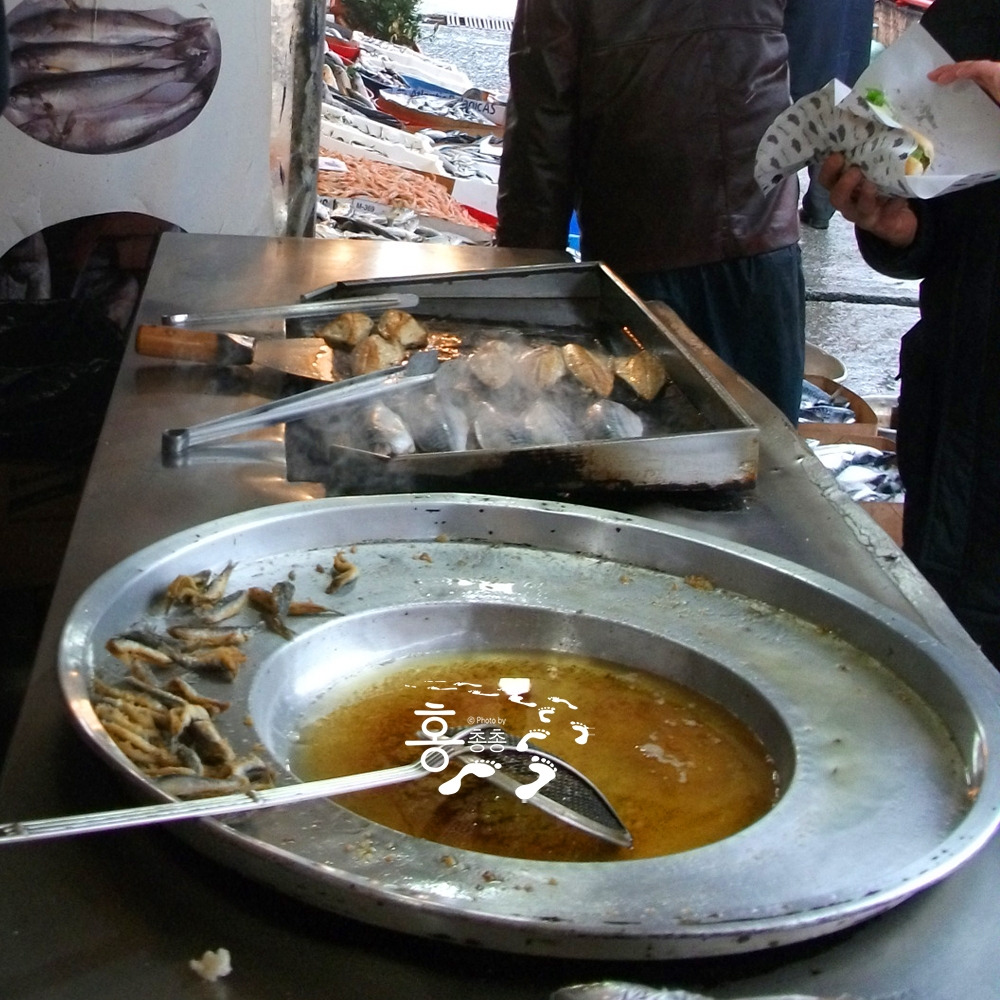 함시를 주문하면 쉐프는 그 자리에서 머리와 내장을 손질한 큼지막한 멸치 한 바가지를 기름에 쏟아붓고 휘휘 젓는다. 기름엔 그 무엇을 튀겨도 맛있다고 했던가. 촤아악~ 하는 청각적인 자극이 먼저 황홀하게 전해져오고 곧 미친 듯이 고소한 냄새가 후각을 자극한다. 한 접시 가득 함시 튀김이 전해져오면 얇은 튀김옷을 입은 멸치들이 노릇노릇한 자태를 뽐내며 황홀하게 유혹한다, 곧 너를 행복하게 해주겠노라고.