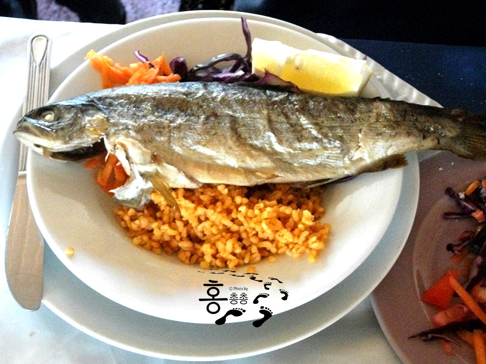 쇠고기 소테는 잘 달궈진 작은 팬에 야채와 쇠고기를 함께 볶아낸 볶음 요리와 비슷한 양념으로 볶아낸 듯한 볶음밥이 소복하게 담겨 있다. 그런데, 헉! 옆을 보니 유럽 친구의 생선 소테가 너무나 환상적이다. 접시에는 내 것과 비슷한 볶음밥이 소복하게 담겨 있고, 그 위에는 구워졌으나 은빛으로 빛나는 생선 한 마리가 통째로 누워있다. 자태가 매우 아름답다. 예상 밖의 신박한 비주얼에 나와 유럽 친구는 한참을 웃는다. 으흘라라 협곡의 맑은 공기가 나와 친구의 폐 속을 마구 헤집는다. 그리고는 꼴깍, 나도 모르게 침이 넘어간다.