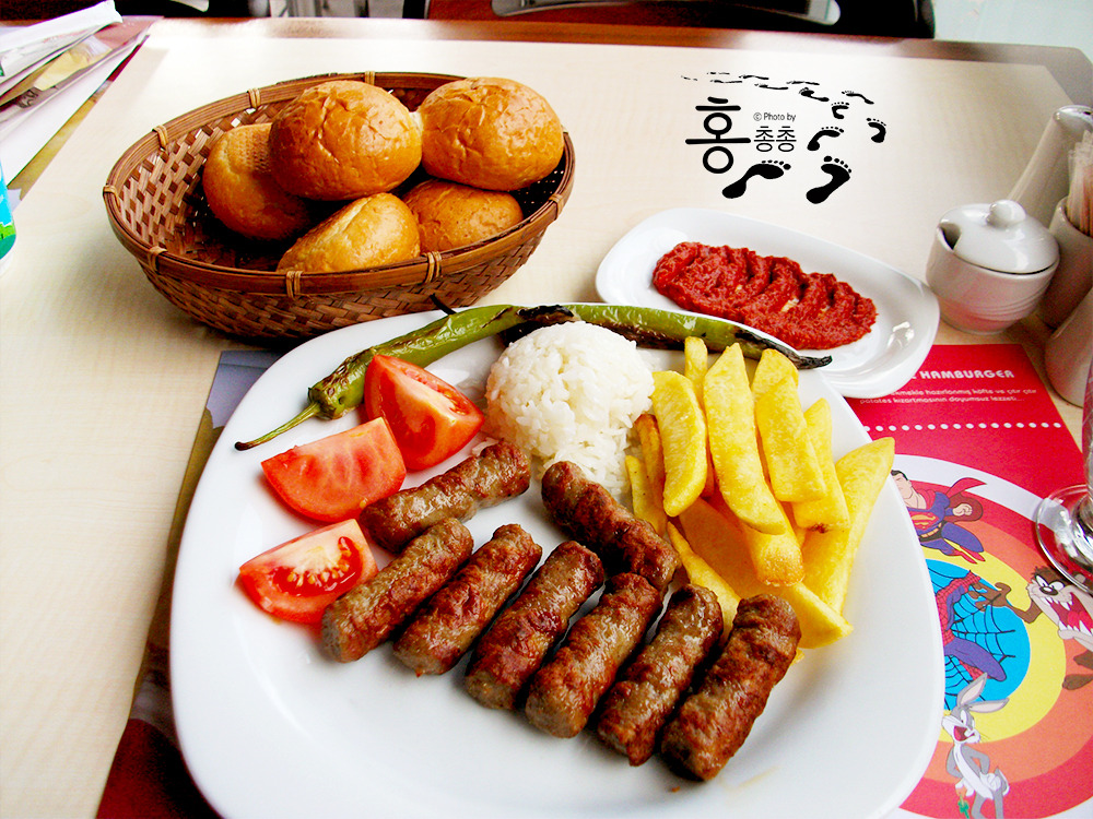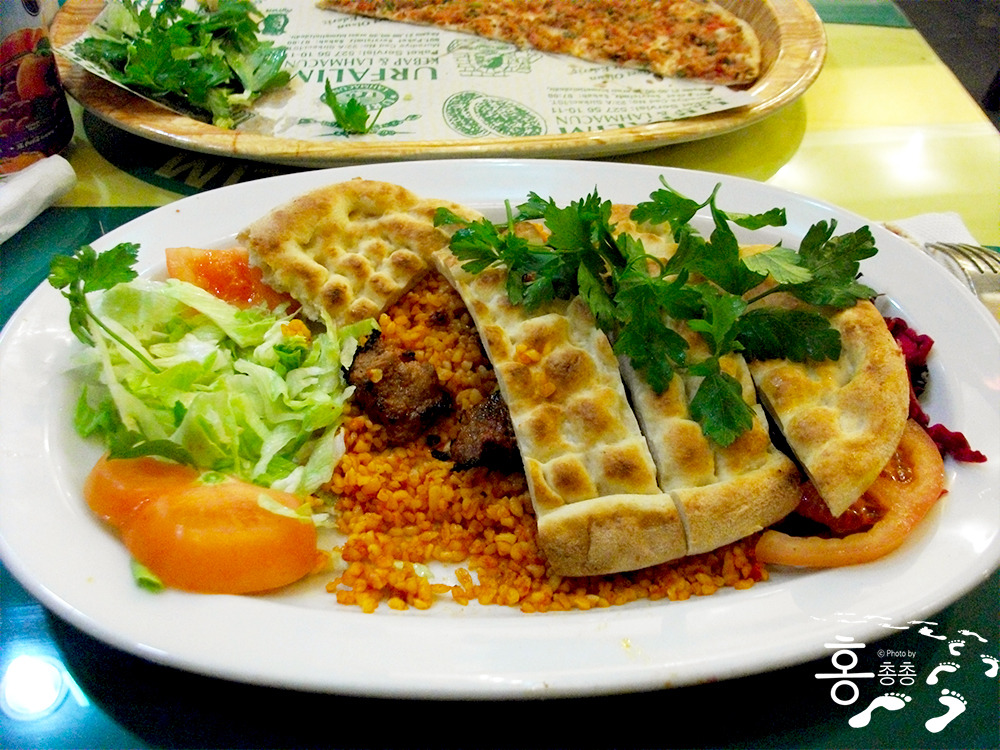 케밥 밑에도 빵이 깔려있다. 이 빵은 케밥에서 나오는 기름기를 흡수해 주는 역할을 하지만, 케밥과 함께 뜯어먹어도 정말 맛있다. 물론 촉촉하게 양념이 밴 빵이 아니라 바삭하고 말랑말랑한 빵을 먹고 싶다면, 바구니에 가득 들어있는 빵을 먹으면 된다.