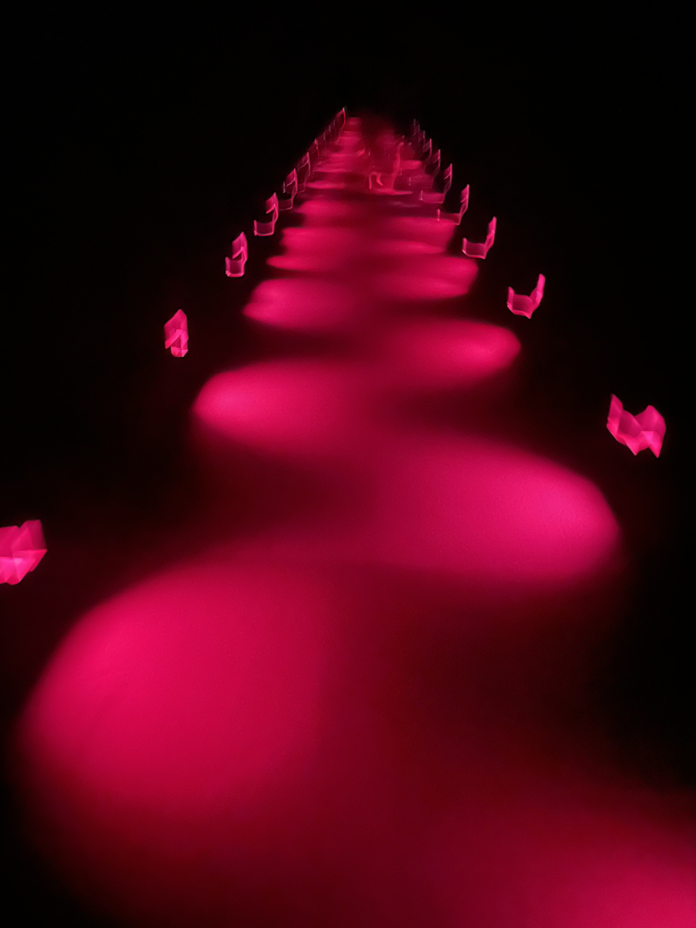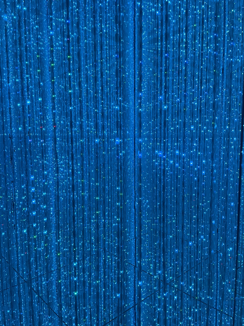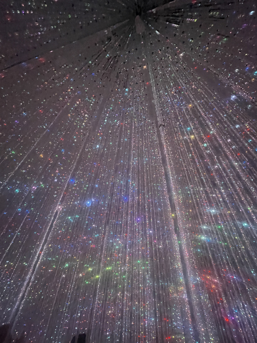 천장에서부터 크리스털 느낌의 무수한 줄이 커튼처럼 뻗어내려와 있다. 벽과 천장, 바닥이 모두 거울로 되어 있어서 공간의 전체 크기가 잘 가늠되지 않는다. 엄청나게 거대한 공간에 와 있다는 착각이 들었다가, 눈이 익숙해지면 사실 그렇지 않다는 걸 알게 된다.
