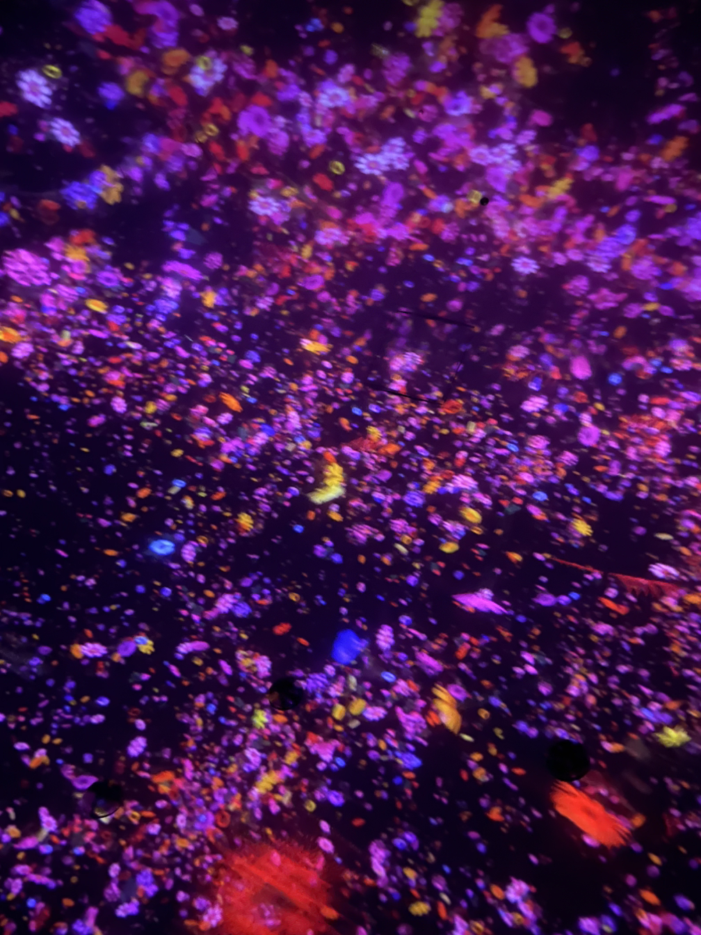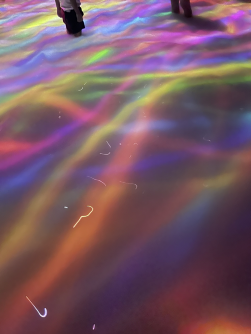 이 잉어와 꽃은 사람들의 움직임에 반응한다. 선명한 잉어가 내 쪽으로 헤엄쳐오다가 나에게 부딪혀 스윽 사라지기도 하고 꽃을 피우기도 한다. 이게 팀랩에서 말한 '이 순간에만 존재하는 전시'구나 싶었다. 잉어가 노는 걸 구경하며 돌아다니다 보니 어느새 모든 잉어들이 아주 빠른 속도로 돌기도 하는데, 그것도 방안의 사람들의 움직임에 반응한 결과인 것 같았다.