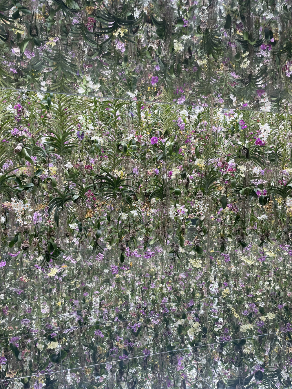 무슨 메세지를 전달하고 싶었던 것인지는 모르고 봤지만 그럼에도 이 생경한 장면은 뭔가 압도적이었다. 6면이 모두 거울로 된 밝은 공간에 생화로 된 꽃다발이 가득 매달려 있다. 이파리와 심지어 뿌리도 보인다. 꽃다발은 천정에서 내려와 거의 바닥 근처까지 뻗어 있다. 사이사이로 앞 팀 사람들이 보인다. 엄마와 딸이 사진을 찍는다. 손주들과 함께 온 할아버지는 구석에 누워 하품을 한다. 평화로운 한 때가 지나고 우리 팀 차례가 되자 기어서 꽃다발 아래로 들어가라는 안내를 받는다. 네..?