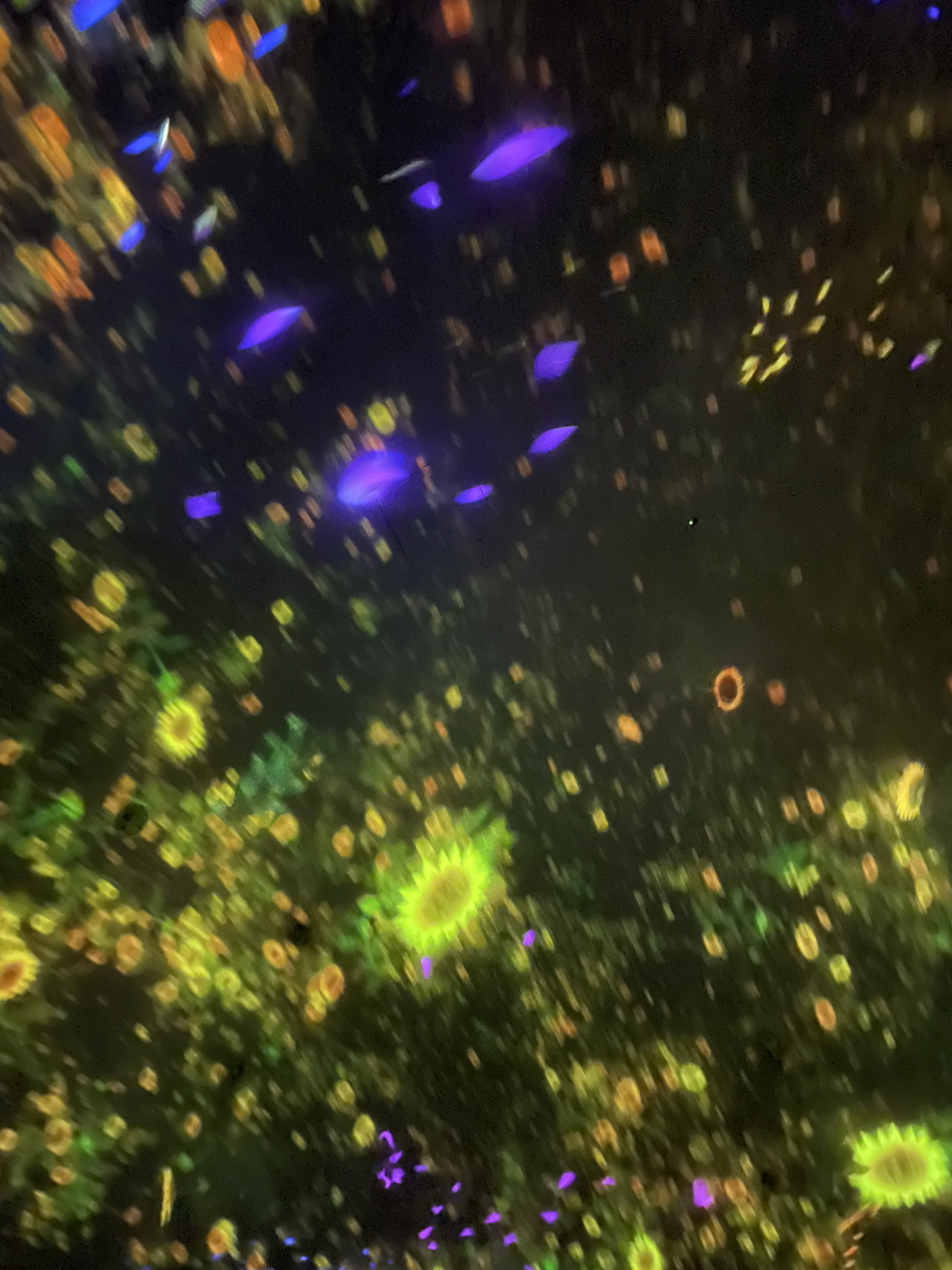 그렇게 놀다가 부유하는 꽃의 방으로 이동했는데 여기는 돔처럼 생긴 공간으로, 가운데 앉아서 전시를 보라고 안내받았다. 여럿이 눕길래 나도 따라 누워 보았다. 꽃이 태어나서 피고 질 때까지를 영상으로 보여준다. 그런 꽃들이 무수하게 꽃의 우주를 떠돌아다니는데, 미리 준비된 영상이 아니라 프로그램으로 그때그때 계속해서 새로운 영상을 생성해서 흘려보내고 있다고 한다. 따라서 특정한 순간의 그 장면은 유일한 것이라고 하는데... 어지러워서 3D게임도 못하는 나로서는 오래 머무를 수 있는 방은 아니었다. 그래도 자유롭게 앉거나 누워서 전시를 본다는 상황 자체가 즐거웠다.