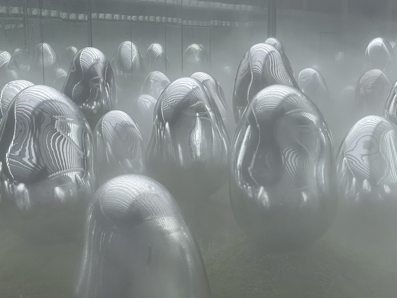 은색 광택을 띈 표면이지만 자세히 보면 안이 비어서 들여다보이는데, 저녁에는 여기서 빛이 난다고 한다. 아무도 만지지 않아서 나도 지켜보기만 했었는데, 그러다 다른 사람들이 웬만큼 떠난 뒤에 보니 직원이 저 오뚝이를 하나씩 밀고 있었다. 밀린 오뚝이들은 흔들리며 희미한 공명음 같은 것을 낸다. 나도 몇 개 밀어서 소리를 내보며 좀더 구경하다가 다음 전시로 이동했다.