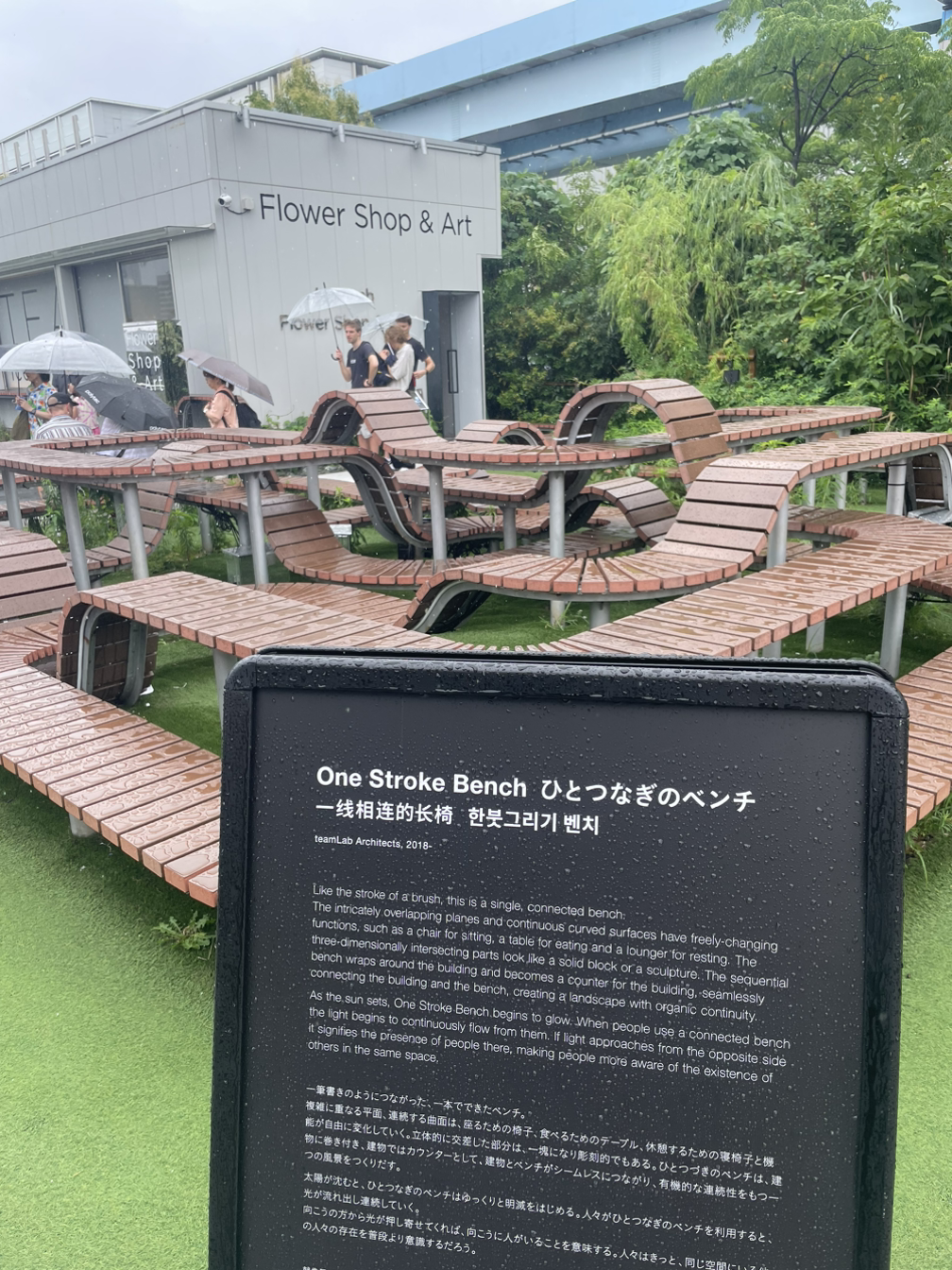굿즈샵이 보이지만 비까지 오다보니 사람이 많을 것이 뻔해 시도도 하지 않았다(어제 인파에 너무 크게 데었다). 한붓그리기 벤치가 재미있다.