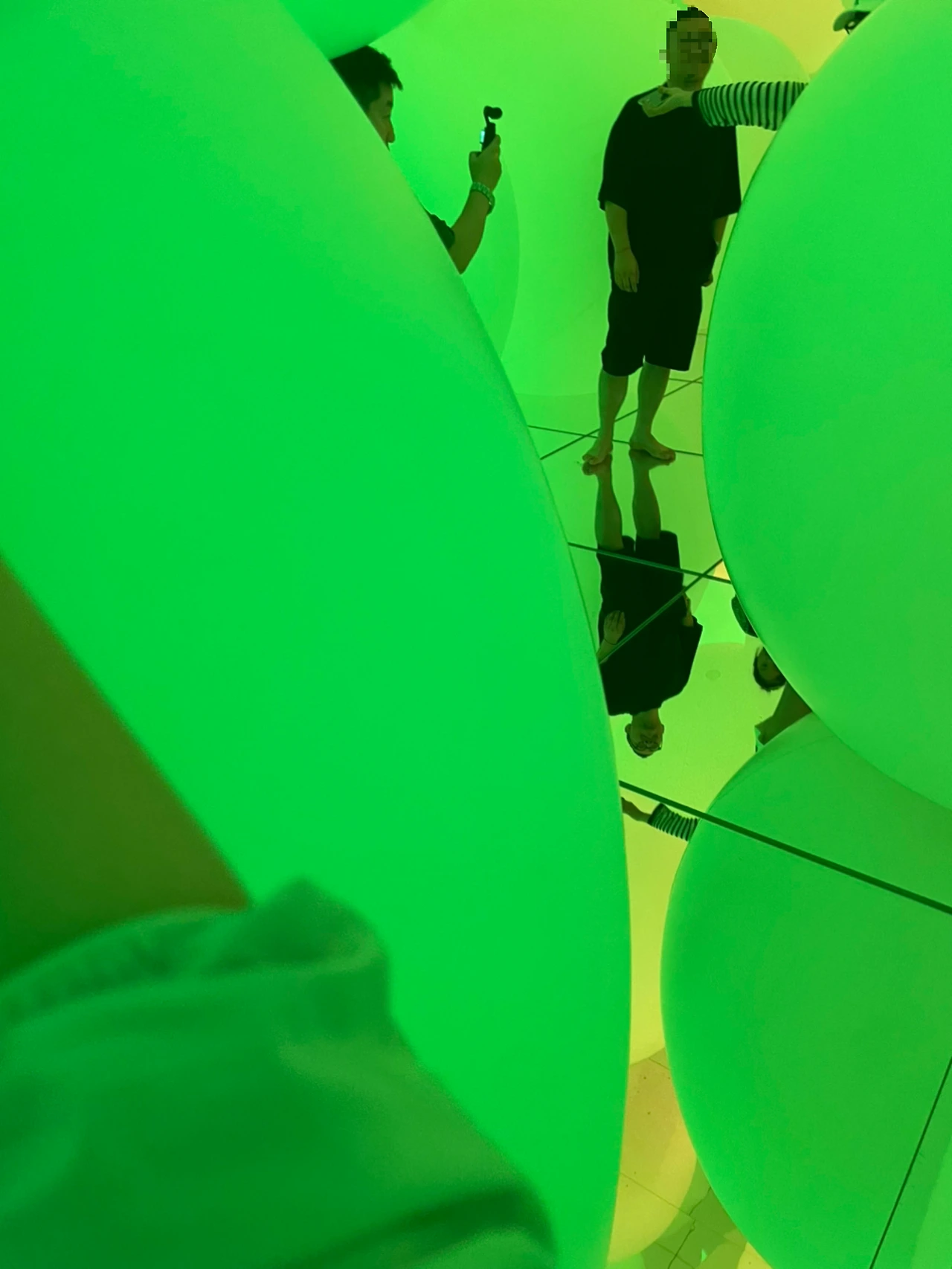 길이 명확하게 나 있는 곳도 있고 줄을 헤치면서 돌아다니기도 한다. 줄의 길이는 짧기도 하고 길기도 하다. 여기서 비로소, 이걸 이대로 '흐음~'하면서 눈으로 보고 지나가다가는 순식간에 전시장 밖으로 나가겠다는 생각이 들어 방을 맴돌면서 사람들이 늘어날 때까지 기다렸다. 사람들이 충분히 들어오자 거울에 비치는 상이 다양해졌고, 이제는 이 방 자체만이 아니라 그에 대한 각양각색의 사람들의 반응까지 볼 수 있어서 볼 거리도 늘어났다.