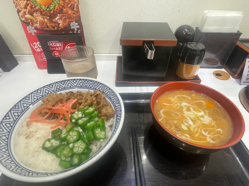 저 밥은 나름 새로 나온 메뉴인지 크게 광고를 하고 있었다. 보리밥에 오크라, 마,간장으로 양념한 고기. 자리마다 비치된 생강을 얹었다. 여름메뉴답고 식감이 색다른 것이 좋았다. 일본 식당에는 숟가락이 없는 곳도 많다지만 요시노야에는 있었는데 천만다행이었다. 없었으면 저 미끌미끌한 마를 어떻게 먹었을지 모르겠다.
