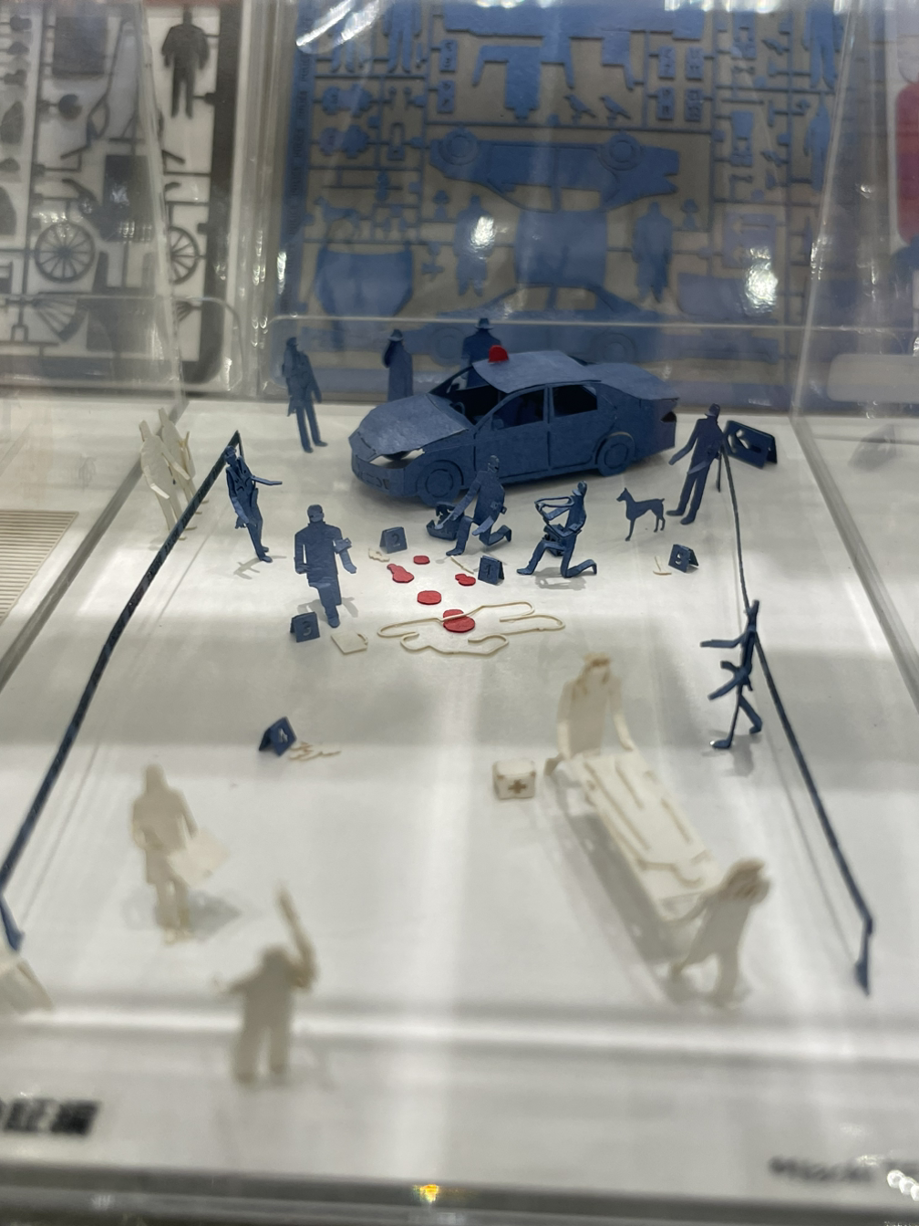 이런 걸 뭐라고 부르더라.. 아무튼 정말 세밀하다. 어렸을 때 문방구에서 팔던 조립 로봇이나 자동차 같은 걸 종이로 만들어놓았는데 부품의 엄청난 반복성이(가령 해바라기 몇십 그루) 놀랍다. 사진에서 배경에 흐리게 보이는 게 전부 부품이다. 저걸 하나하나 떼어 완성한 게 앞에 있는 작품. 장인의 나라? 디테일의 나라? 사고 장면은 추리소설의 한 장면 같아 재밌다. 오히려 해바라기 꽃밭은 기분 탓인지 가운데 사람이 서 있는 게 좀 으스스해.