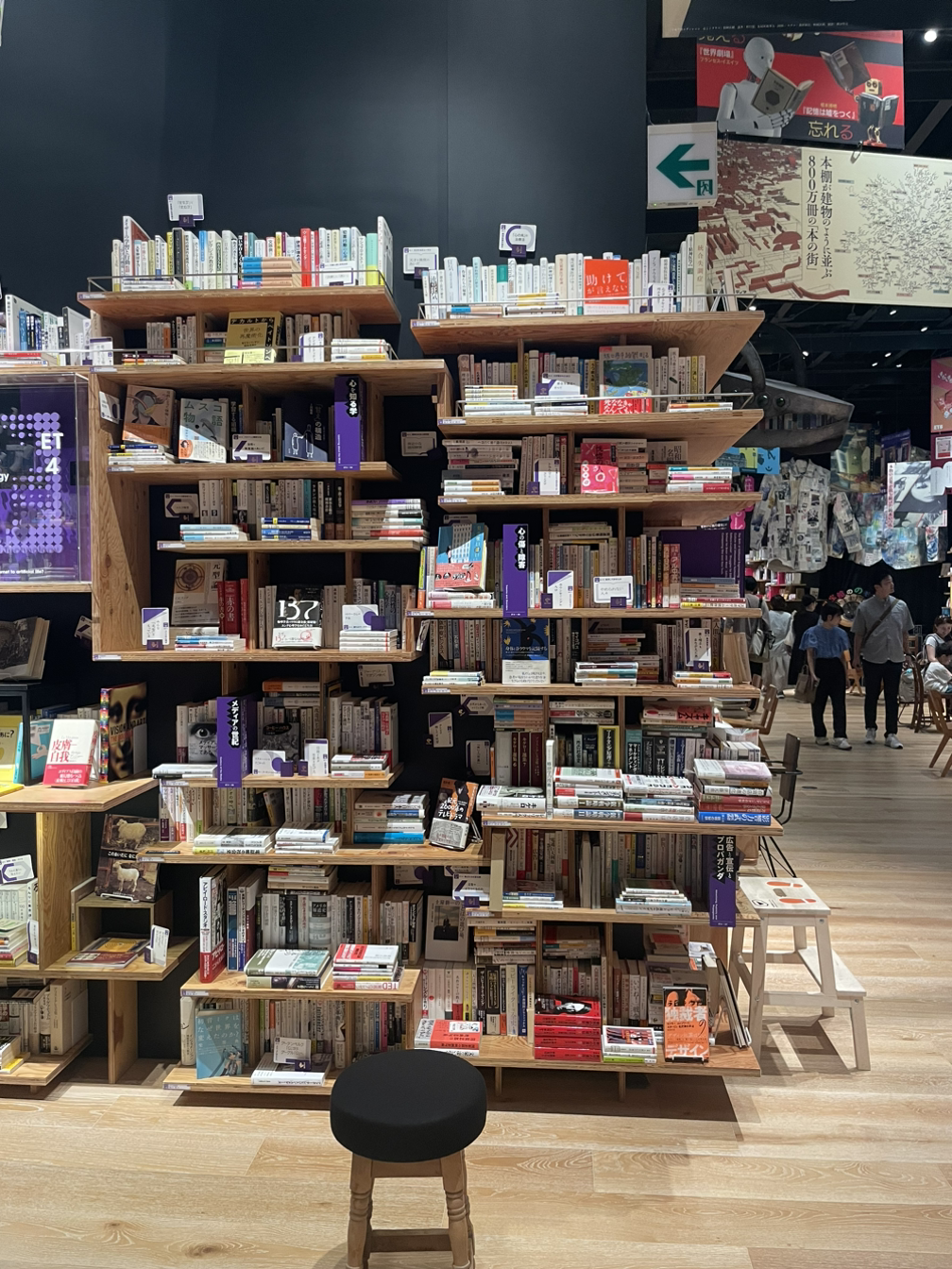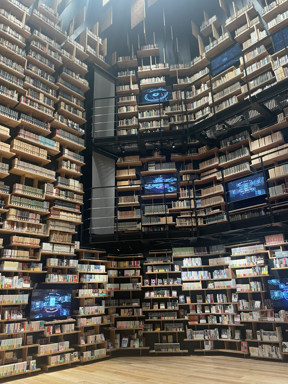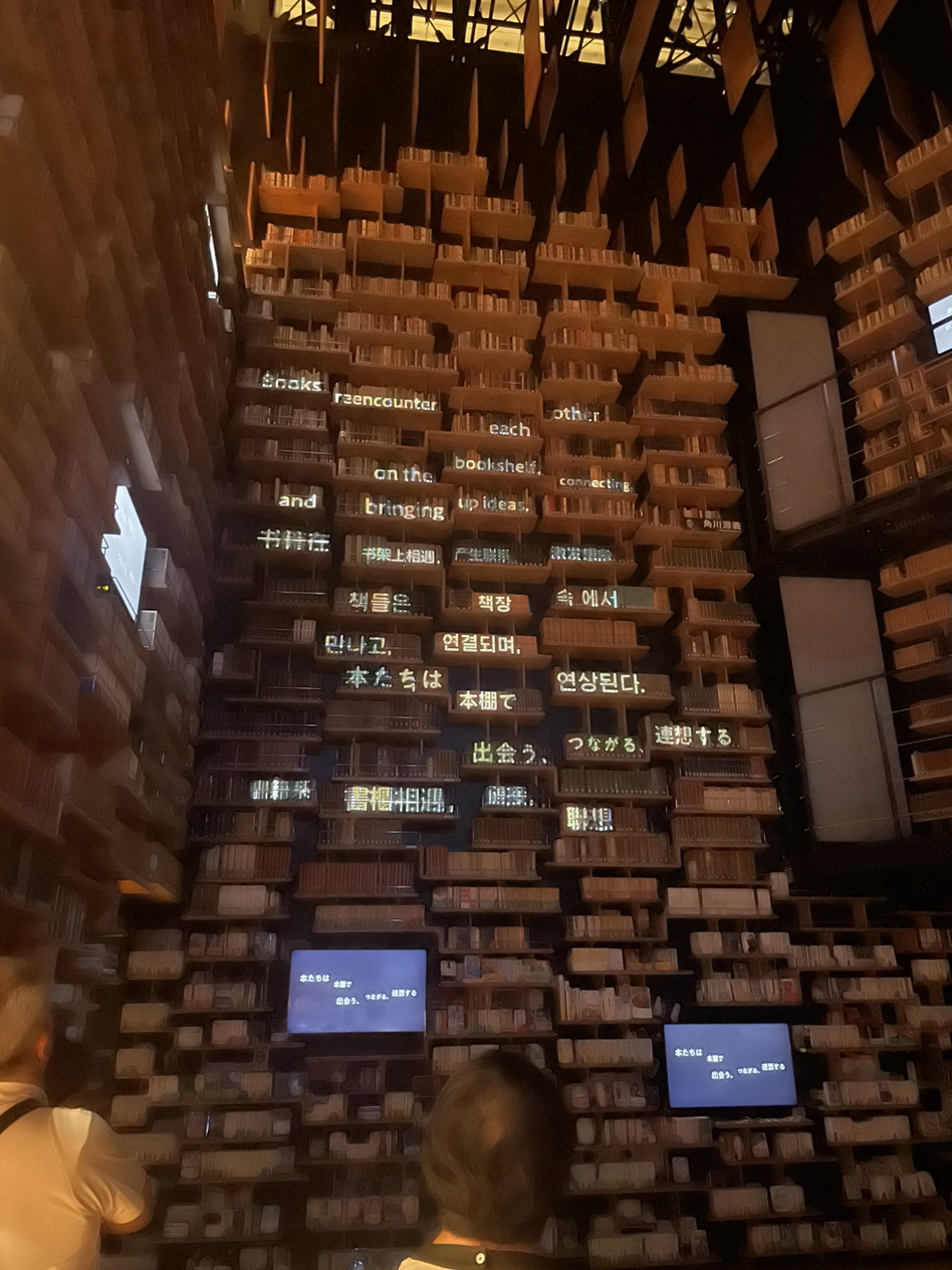 그리고 더 깊숙히 들어가니 온갖 크고 작은 책이 신기한 모양의 책장에 꽂히고, 얹히고, 튀어나와 있었다. 이 책장도 쿠마 켄고가 설계했다는 것 같다(아마도). 전시설명용 앱이 있어서 그걸 설치해서 보면서 다녔다.