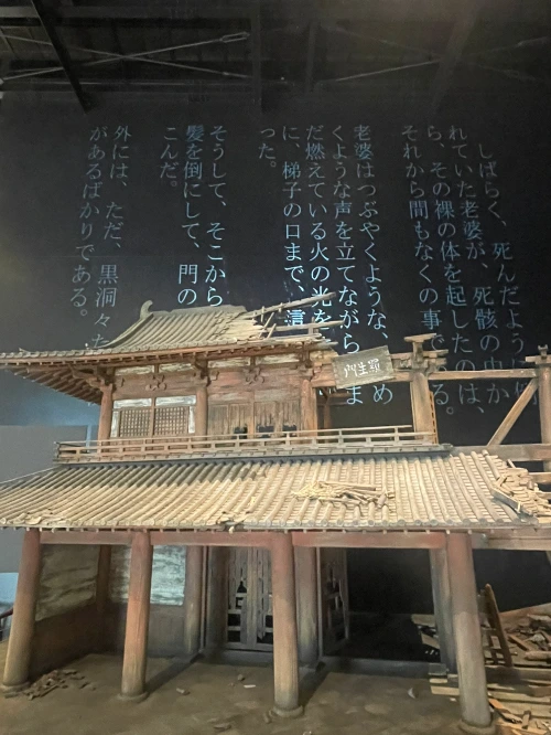 로비에는 어쩐지 라쇼몽에 나오는 집의 모형을 전시해 두었다. 설명판에 구글 번역기를 들이대 보았지만 왜 여기 이것이 있는지는 알아내지 못했다. 뒷배경으로 글자가 비처럼 내리는 모습을 영상으로 연출했다. 사진에는 글씨가 그냥 인쇄된 것처럼 나와서 그 비 내리는 연출을 담을 수 없는 게 아쉽다.