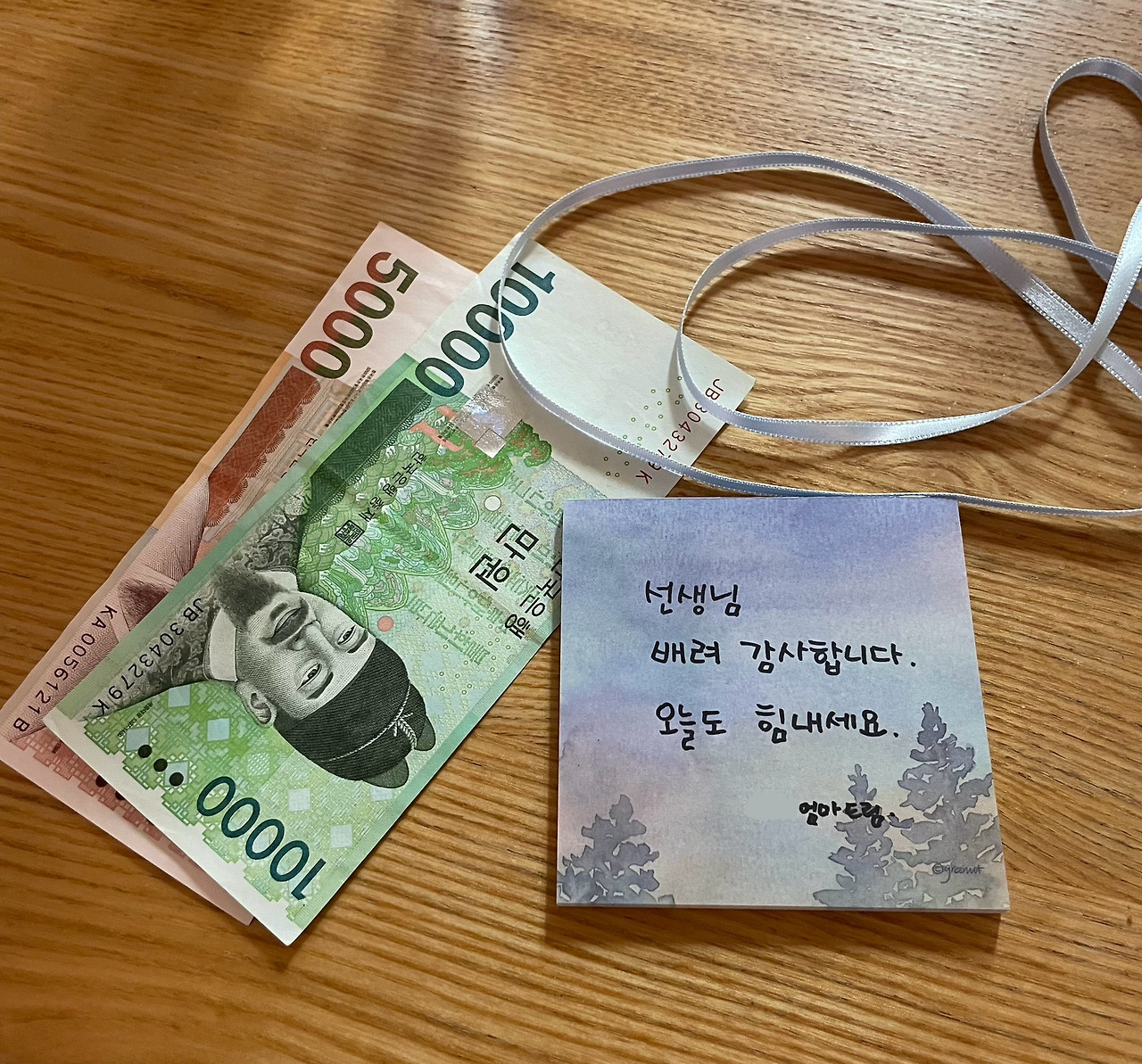 아차, 참가비. 이제 와서 돈만 덜렁 보내기도, 봉투에 넣기도, 선생님 카톡으로 송금하기도 모두 내키지 않아 뇌를 굴려본다. 돌돌 말은 마음을 건순이 가방 앞주머니에 넣어 보냈다. 현금도 잘 안 가지고 다니는 요즘 세상에 재촉도 없이 먼저 참가비를 내주신 선생님 감사드립니다. 스승의 은혜를 한 겹 정도는 갚을 수 있기를.