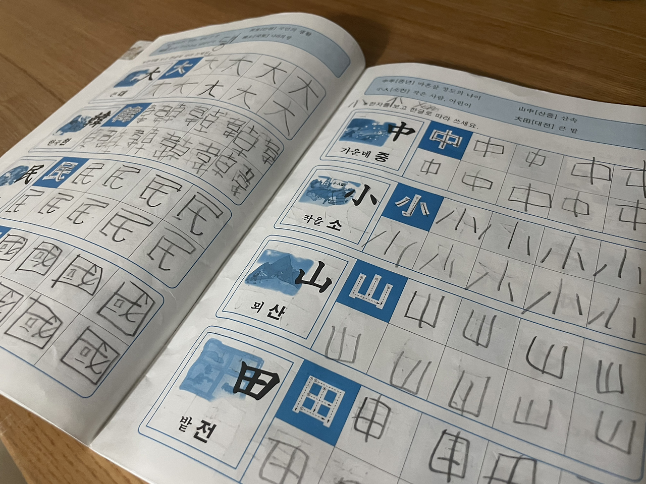 건순이가 가지고 온 시험대비교재를 넘겨본다. 엄마도 모르게 유치원에서 따라 그려온 한자들이 빼곡하다. 유치원 생활에 대해 재잘재잘해 주는 건순이가 이렇게 꼭꼭 눌러쓰느라 손이 아팠다는 한 마디를 안 했다. 그만큼 관심 밖의 일이었나 보다. 뒤늦게 해보겠다고 마음 먹고 나서는 구깃해진 교재 뒷편의 기출문제를 풀어보겠다고 엄마에게 도움을 청해온다. 문제를 읽는 것 부터가 문제.