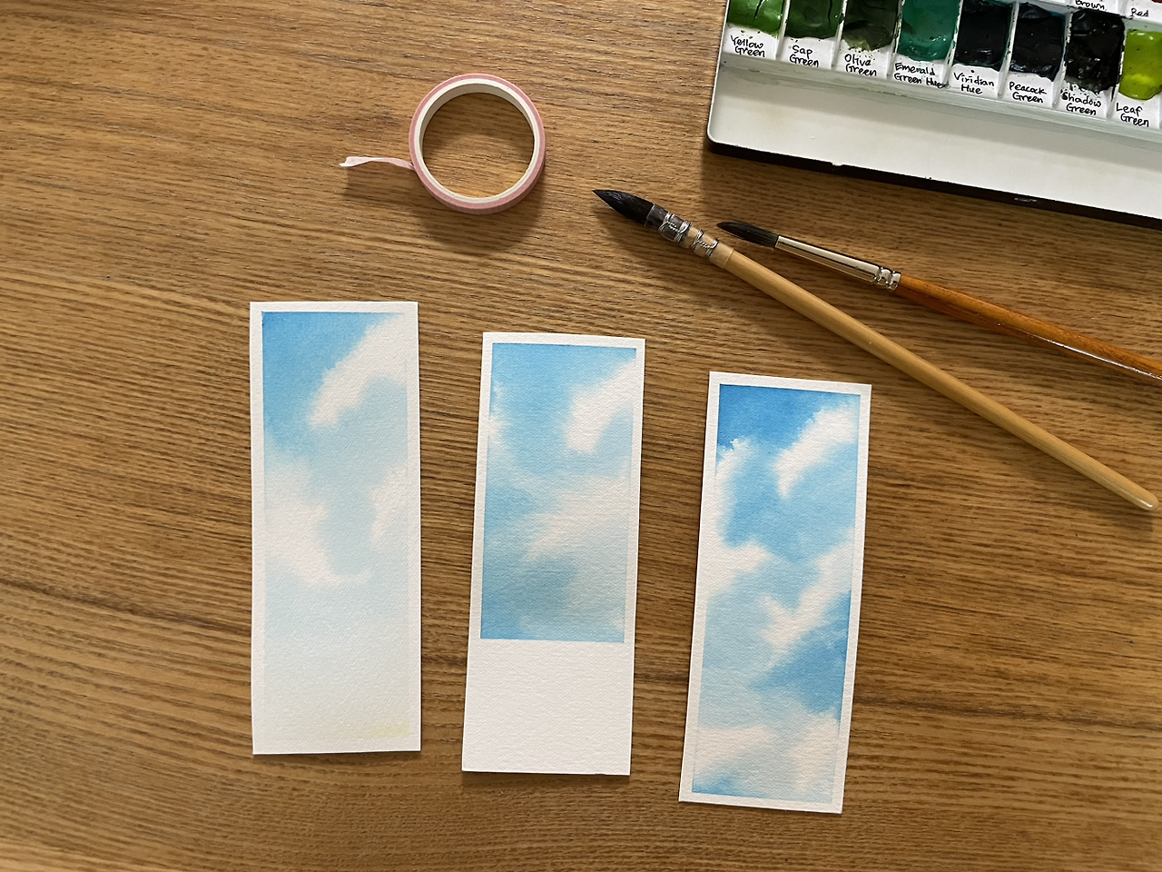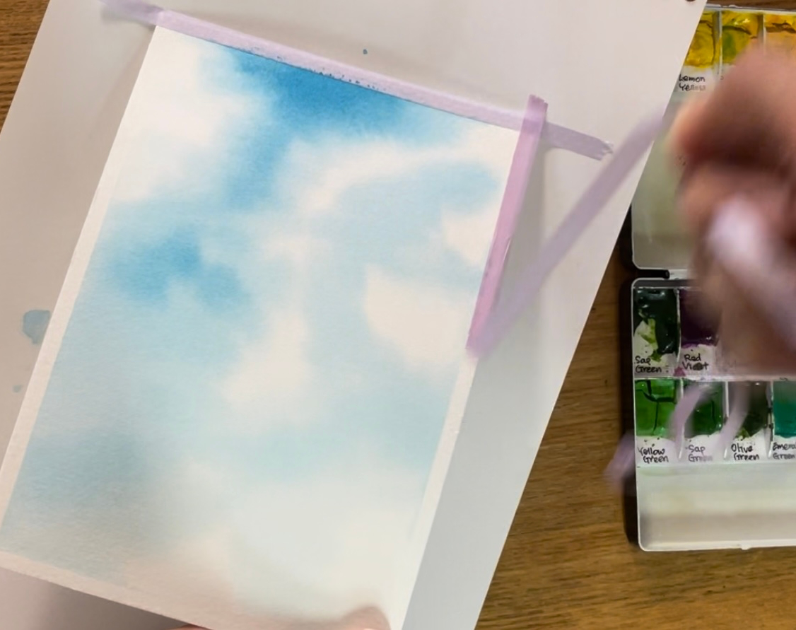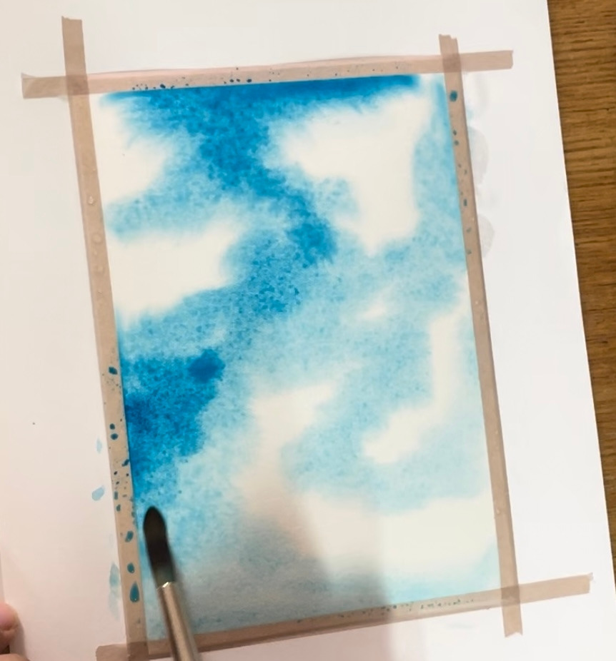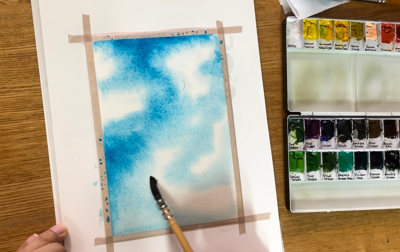 4단계. 구름의 위치를 헤아리며 종이의 하얀 부분을 남겨준다. 수채화에서는 흰색 물감을 잘 쓰지 않기에, 흰 구름 부분은 색을 칠하지 않은 맨 종이다. 구름과 하늘이 만나는 경계선에 물이 고이면 얼룩이 생길 수 있으니 물 양을 적절히 조절해 주는 게 중요하다.