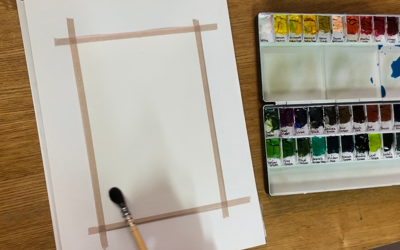 하나. 수채화 종이 테두리에 마스킹테이프를 붙여준다. 이는 물감이 스며들지 못하게 하면서 고정도 해주는 역할이다.