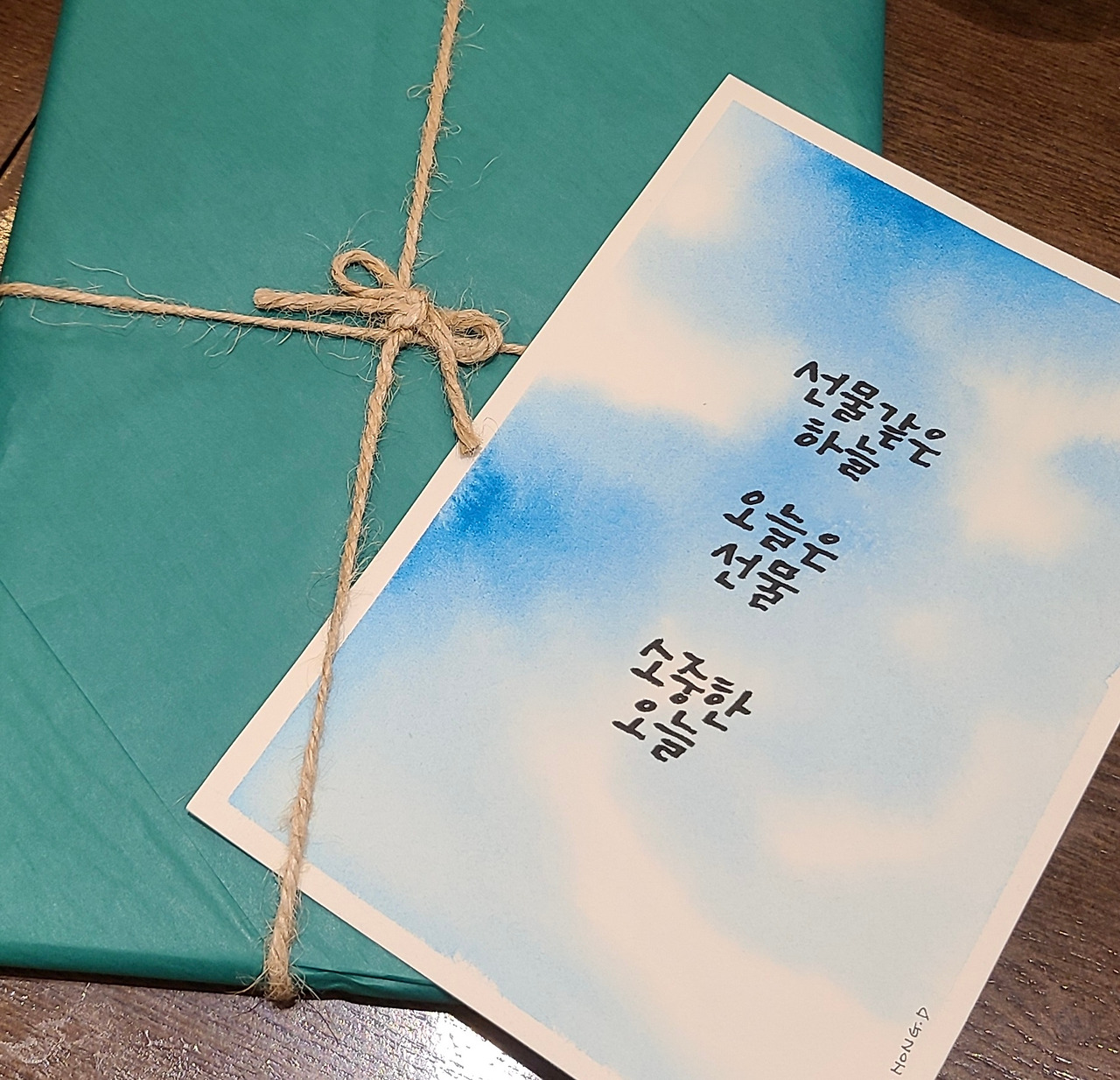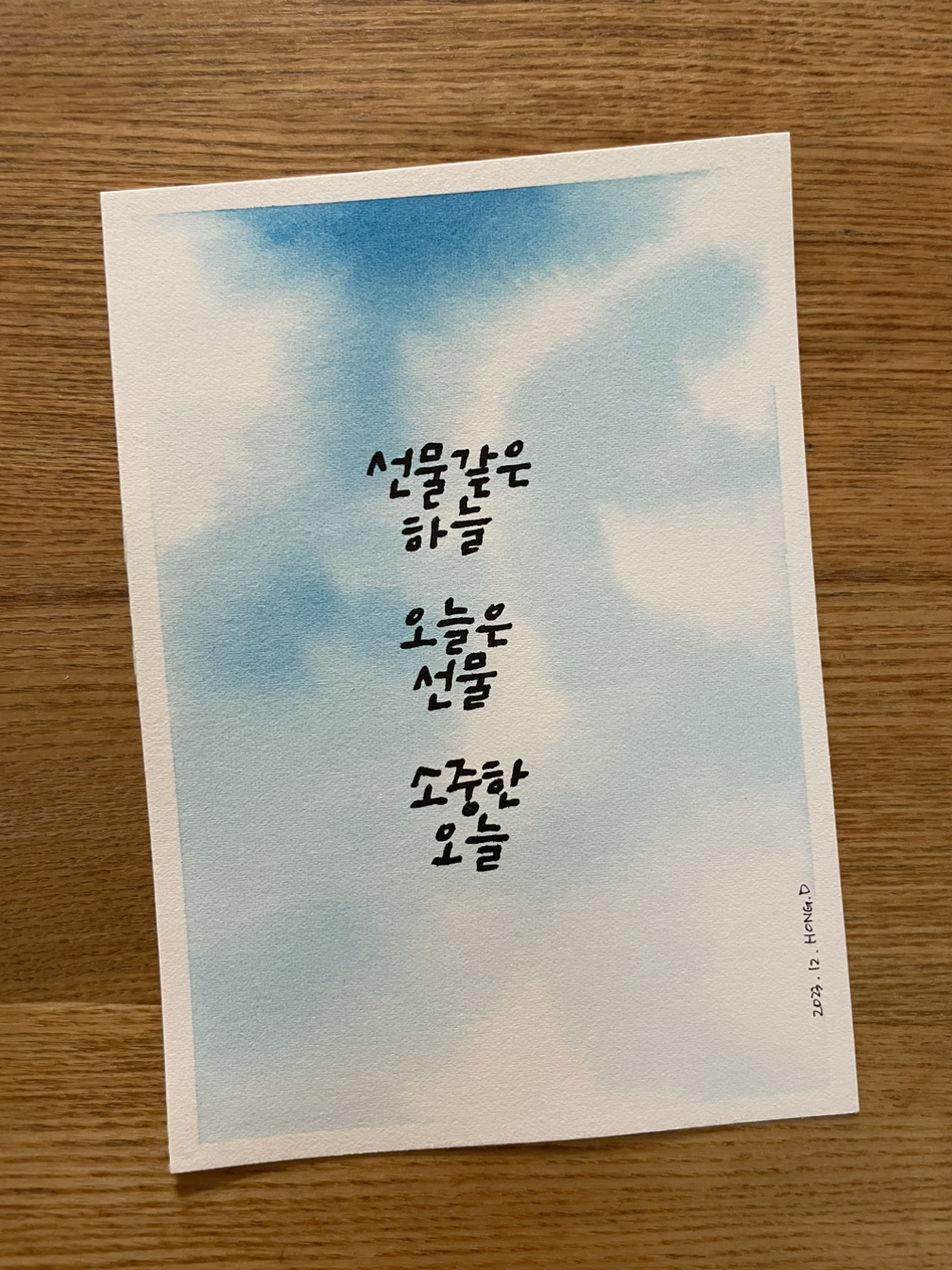 8단계. 드디어 선물하고 싶은 손글씨를 적어본다. 여태껏 공들인 바닥을 망칠까 두렵다. 아 다르고 어 다르다고 한 글자 쓰는데도 고민이 이만저만이 아니다. 캘리그라피 고수도 아니고 손글씨는 누구에게나 쑥스럽다.