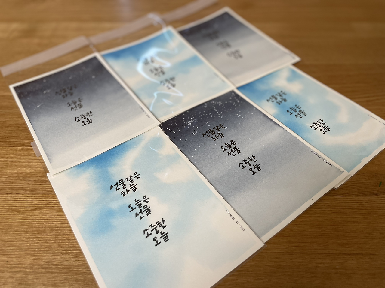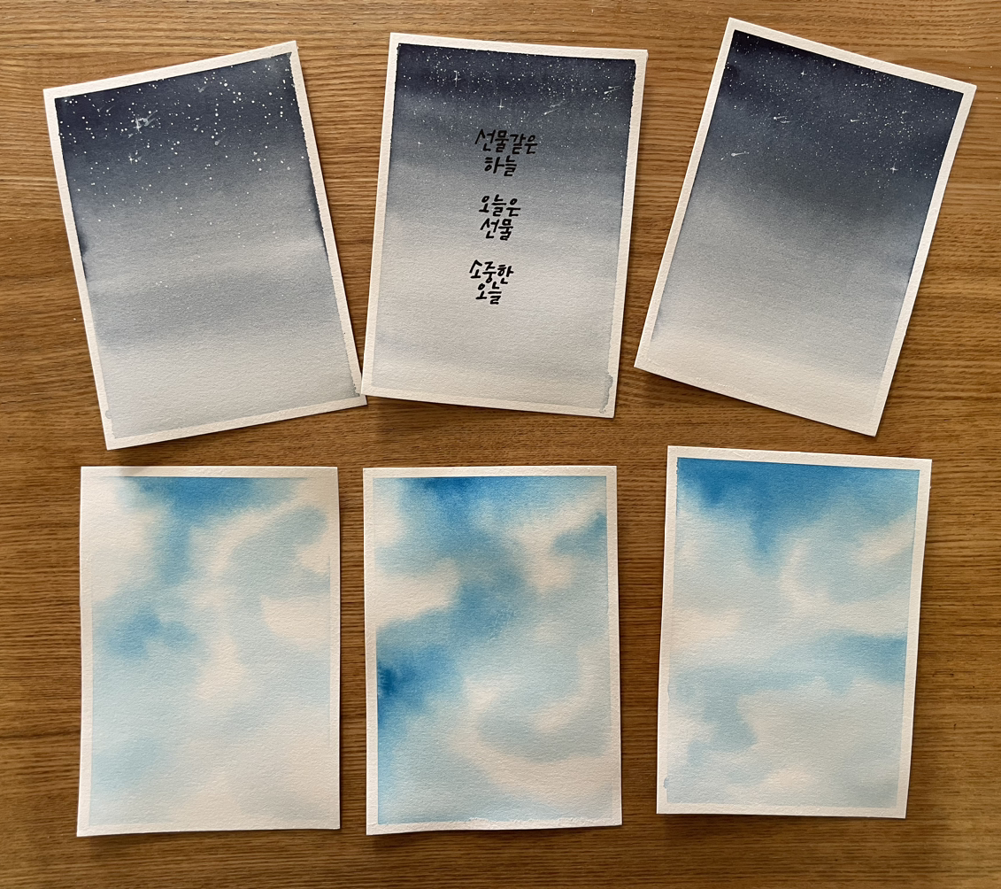 하늘 배경을 완성하고도 고이 기다리는 마음이 필요하다. 통풍이 잘 되는 곳에 놓아두고 완벽히 마르기를 기다리고, 꿀렁이는 엽서를 벽돌책에 끼워두고 판판하게 펴지길 기다린다. 잠시 쉬었다 가는 힘조절이 필요하다. 우리가 살아가는 요령처럼.