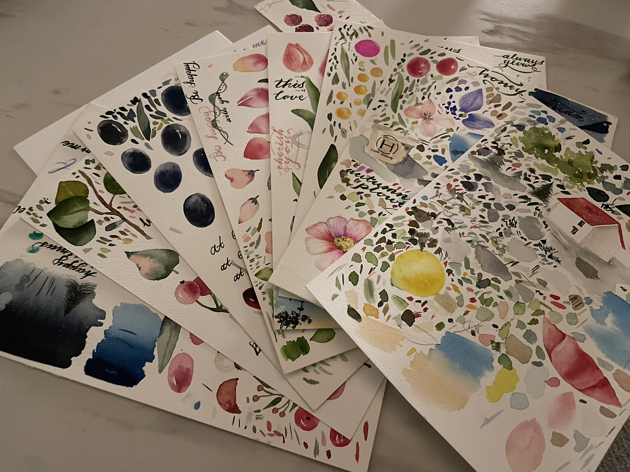 색상표를 대신한 애정의 찌끄래기들. 마음에 드는 칼라를 찾기 위해 붓을 꾹 찍어보기도 하고, 기법을 미리 한 번 연습해보기도 했다. 빈 종이가 빼곡히 채워져간 시간의 흔적들이다.