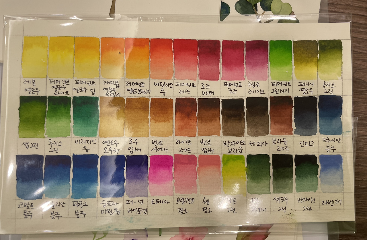 수채화를 처음 배우게 되면 스승님의 견본처럼 색상표(왼쪽 사진)를 만드는 게 좋다. 색상명이 동일하더라도 브랜드마다 색의 차이가 있을 수도 있고, 팔레트에 짜놓은 물감색만으로는 발색을 가늠하기 어렵기 때문이다. 각 칼라별로 물과 물감의 농도를 조절하여 진한 5단계부터 연한 1단계까지의 그라데이션으로 표를 만든다.