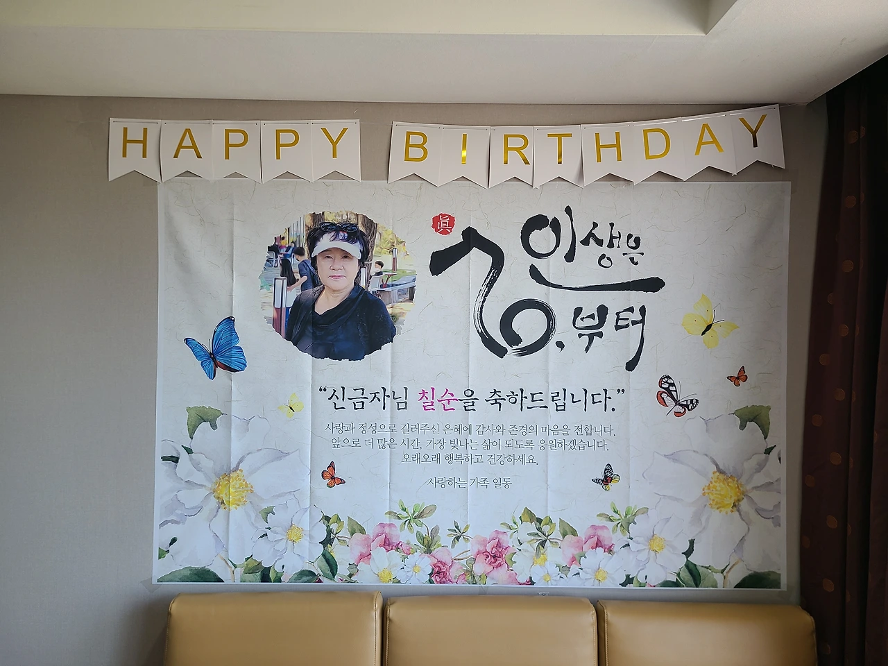 현수막에 글귀와 사진을 넣어 주문하고, 파티용품, 상차림용 떡, 과일이나 케이크 등 장보기 목록도 준비했지요. 여행 중 식사를 할 식당도 미리 알아보고 예약했습니다.