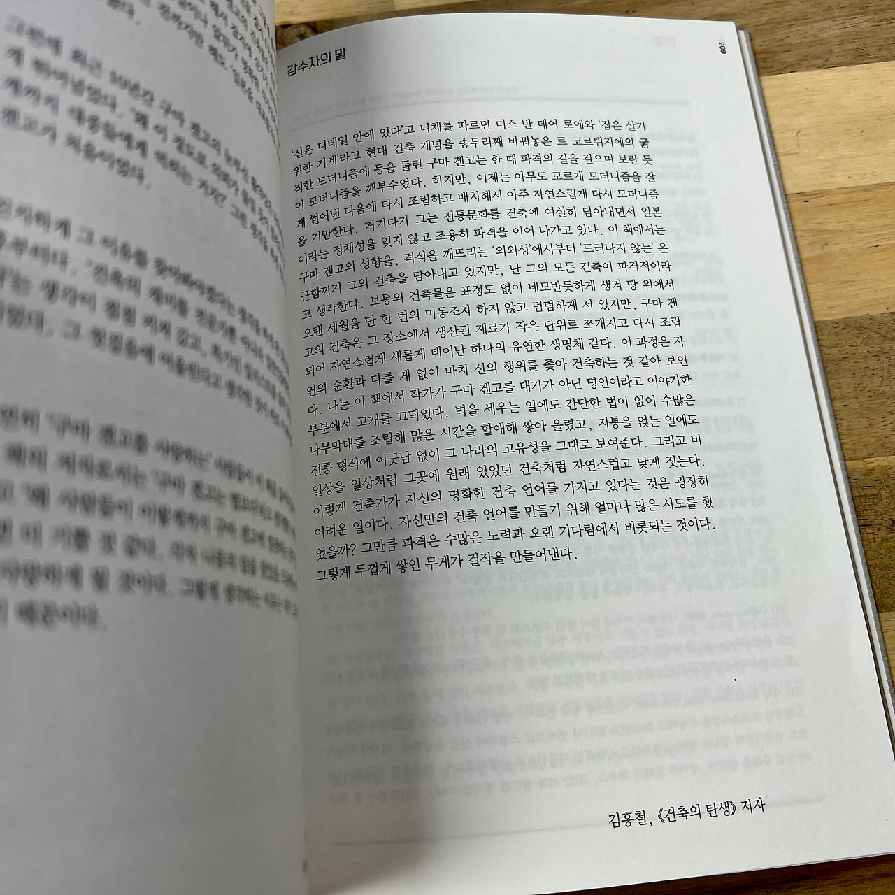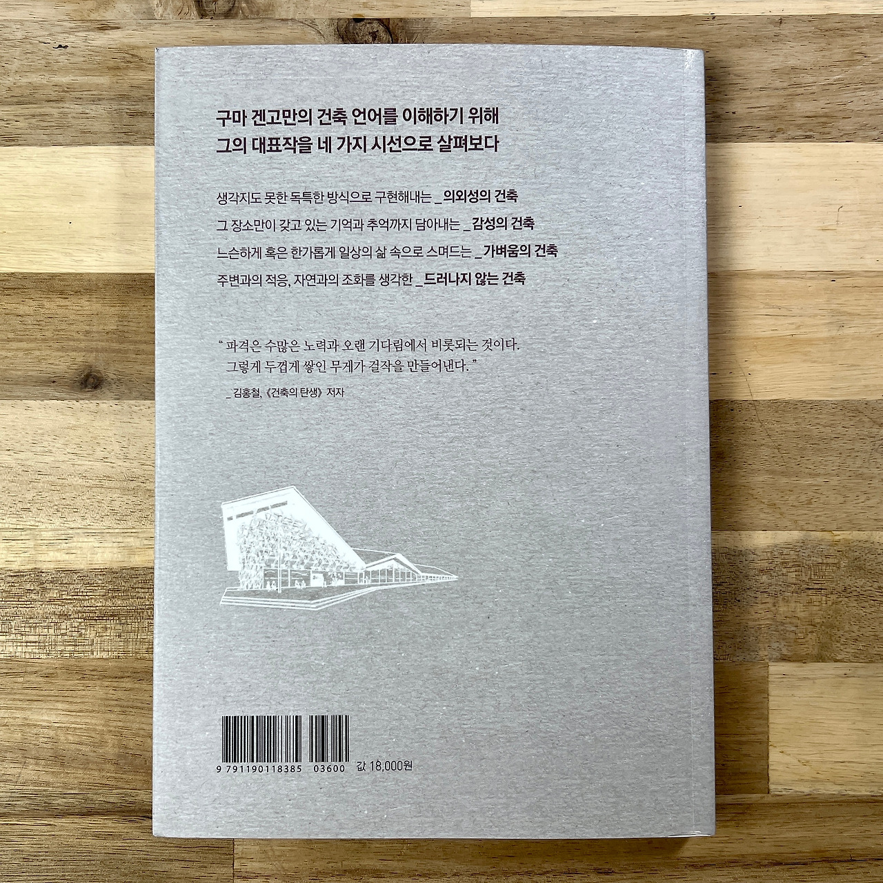 나는 이 책에서 작가가 구마 겐고를 대가가 아닌 명인이라고 이야기한 부분에서 고개를 끄덕였다. 벽을 세우는 일에도 간단한 법이 없이 수많은 나무막대를 조립해 많은 시간을 할애해 쌓아 올렸고, 지붕을 얹는 일에도 전통 형식에 어긋남 없이 그 나라의 고유성을 그대로 보여준다. 그리고 비일상을 일상처럼 그곳에 원래 있었던 건축처럼 자연스럽고 낮게 짓는다.